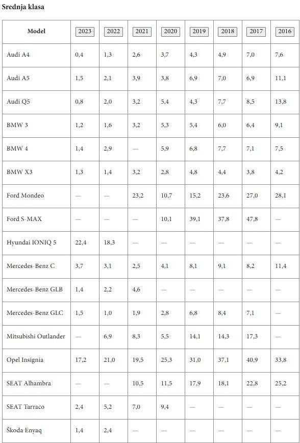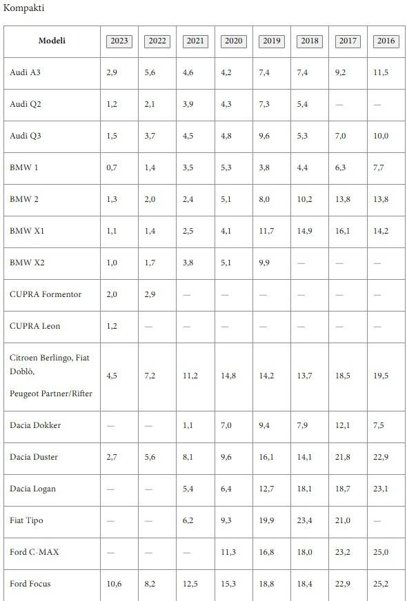 Mini (0,3) i Audi A4 (0,4) pokazali su se najboljima među vozilima starim dvije godine s motorima s unutarnjim izgaranjem. Najboljim električnim automobilom proglašen je Tesla Model 3 (0,5). Ukupno je dvanaest modela imalo indeks kvara manji od 1. Osim Toyotinih modela (Yaris Cross 40.0; Yaris 29.2; C-HR 16.4; RAV4 18.4), negativnu pozornost privukao je i električni automobil – visoka osjetljivost na kvarove Hyundaija IONIQ 5 (22.4) posljedica je problema s integriranom kontrolnom jedinicom punjenja (ICCU) što je već rezultiralo opozivom Savezne uprave za motorni promet.