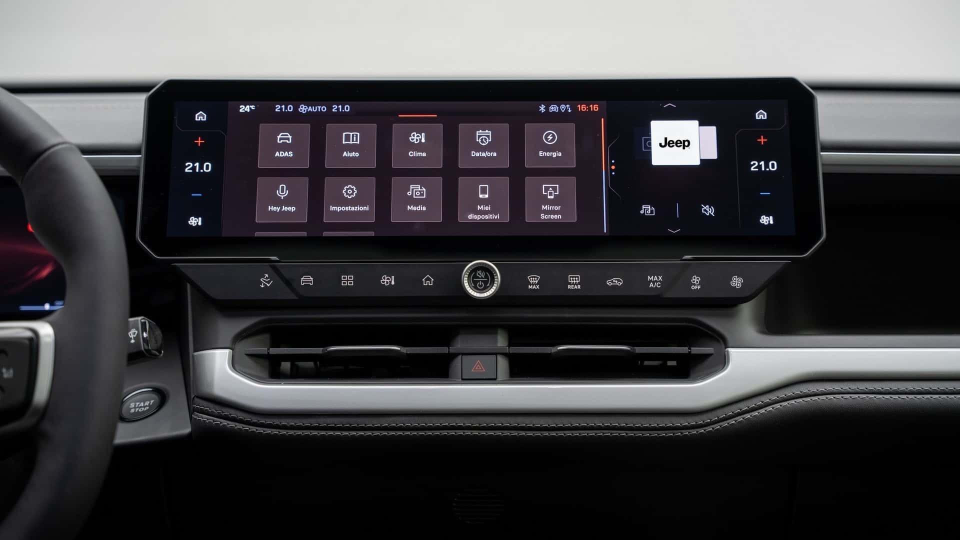 Unutra je Jeep napravio veliki skok i u pogledu dizajna i u pogledu tehnologije. Ispred vozača je 10-inčni zaslon instrumenata, a u sredini je ogromni 16-inčni infotainment zaslon.. Središnja konzola i armaturna ploča naglašene su završnim obradama u stilu aluminija, a u autu ima i puno prostora za pohranu.