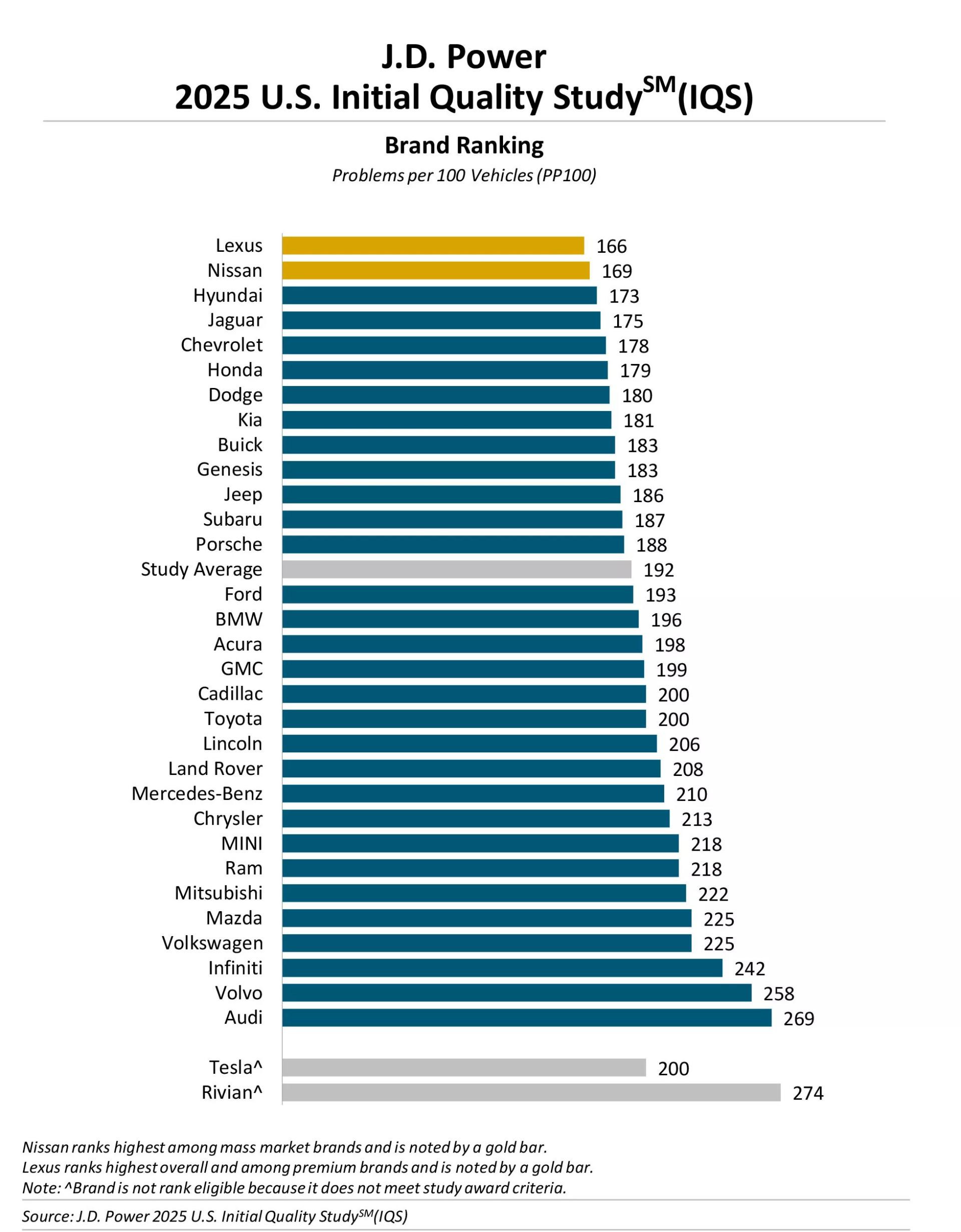 Lexus je ukupno zauzeo prvo mjesto s rezultatom od 166 problema na 100 vozila. Slijede Nissan (169), Hyundai (173), Jaguar (175) i Chevrolet (178). S druge strane ljestvice našli su se Rivian (274), Audi (269), Volvo (258), a Tesla je, iako napredovala, ostala na 200 problema po 100 vozila.