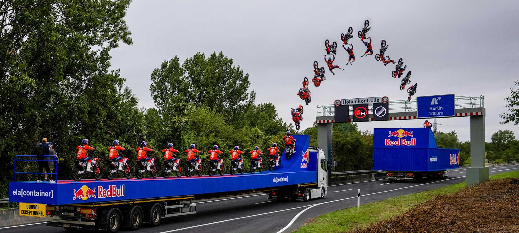 Njemački freestyle vozač motocikla Luc Ackermann izveo je nevjerojatan salto unatrag između dva kamiona u pokretu. Ne samo da je izveo salto između kamiona, već je istovremeno preskočio i konstrukciju s prometnim znakovima na autocesti.