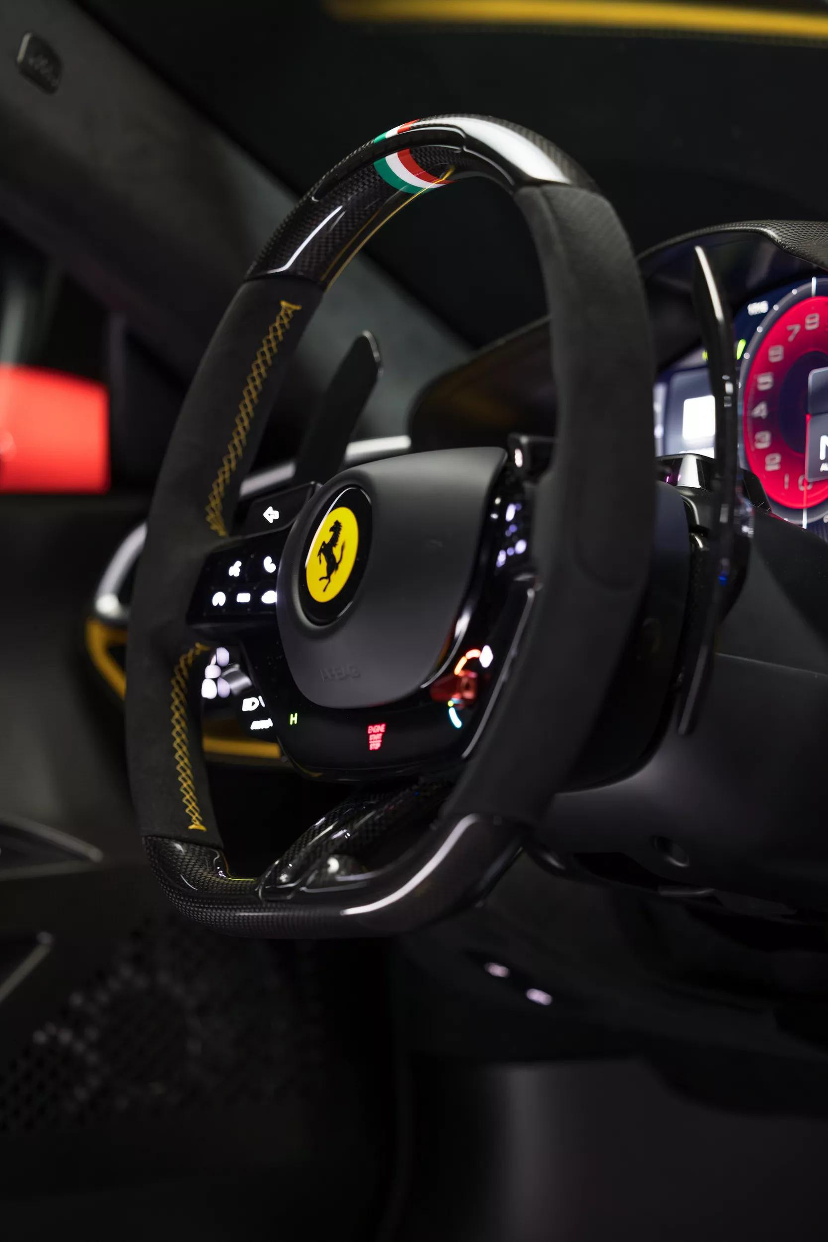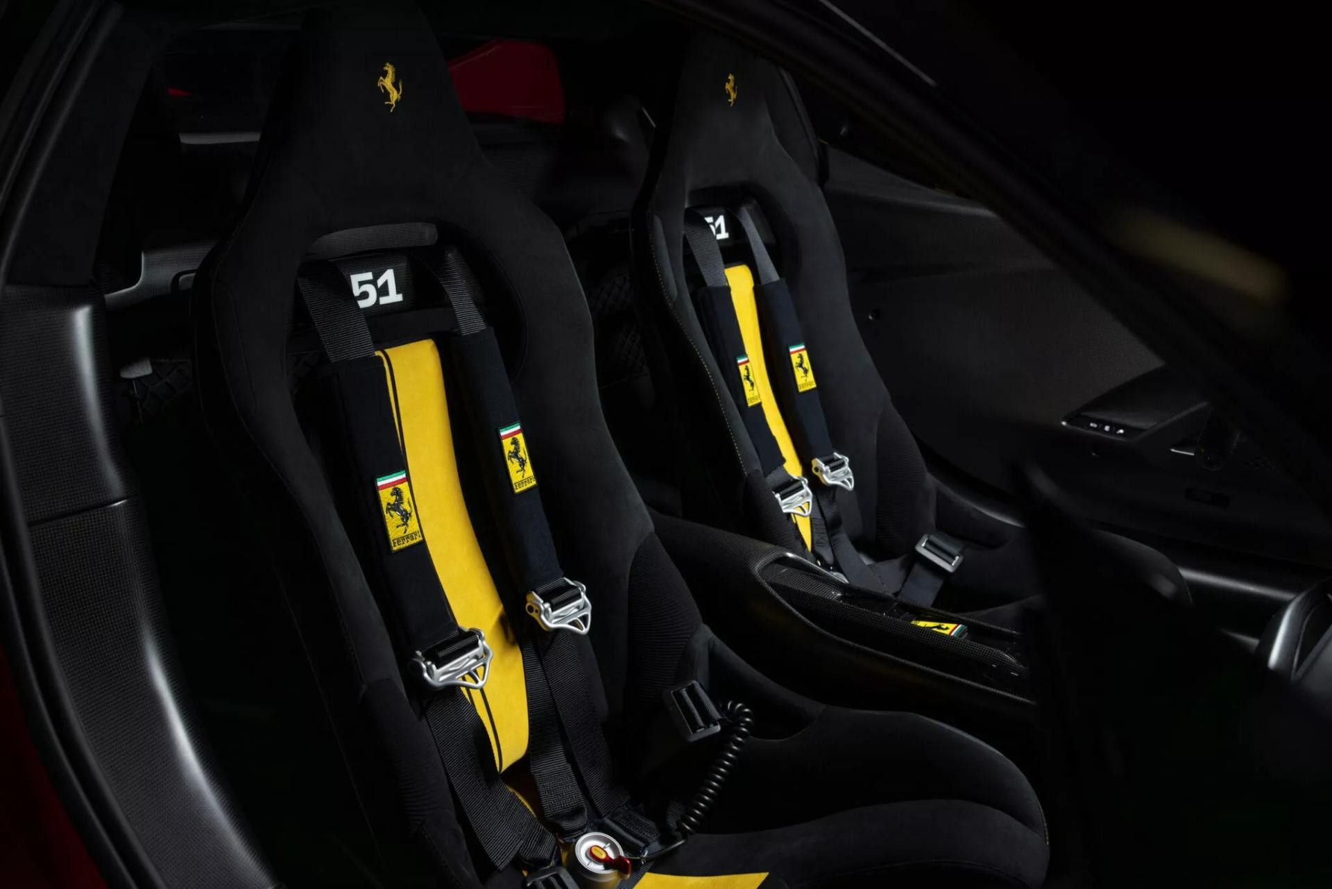 Putnička kabina dodatno naglašava sportski karakter automobila. Sjedala su izrađena od istog nezapaljivog materijala koji se koristi u trkaćim kombinezonima, dok su pragovi vrata i podni umetci izvedeni u karbonskim i metalnim varijantama, također s mogućnošću individualnog dizajna. Upravljač krasi talijanska trobojnica, a brojni grafički detalji naglašavaju povezanost vozila s Ferrarijevom trkaćom tradicijom.