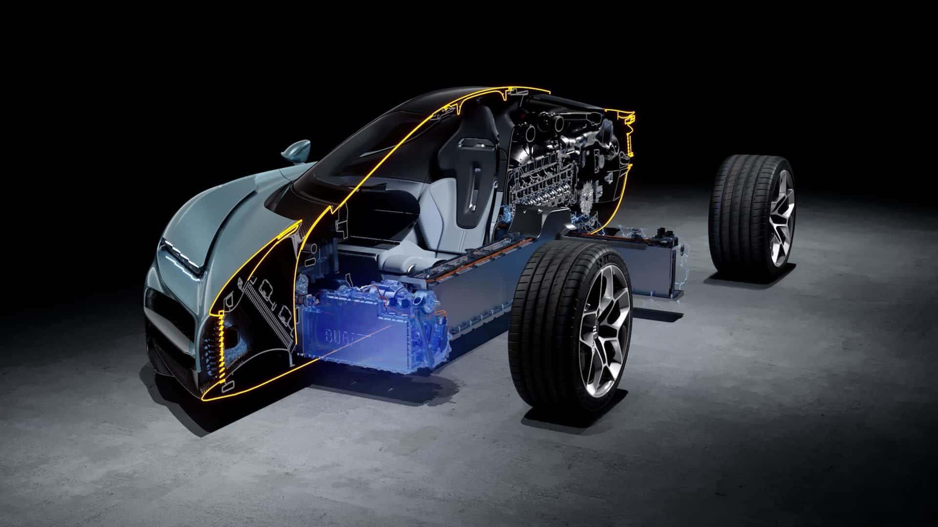 Motor je integriran s električnim pogonom stražnje osovine: elektromotorom snage 340 KS, uparenim s osmerostupanjskim mjenjačem s dvostrukom spojkom i naprednim sustavom raspodjele okretnog momenta (torque vectoring). Ova cjelina benzinskog, električnog motora i mjenjača teži svega 430 kilograma, jednako kao sam motor prethodnog modela Chiron.