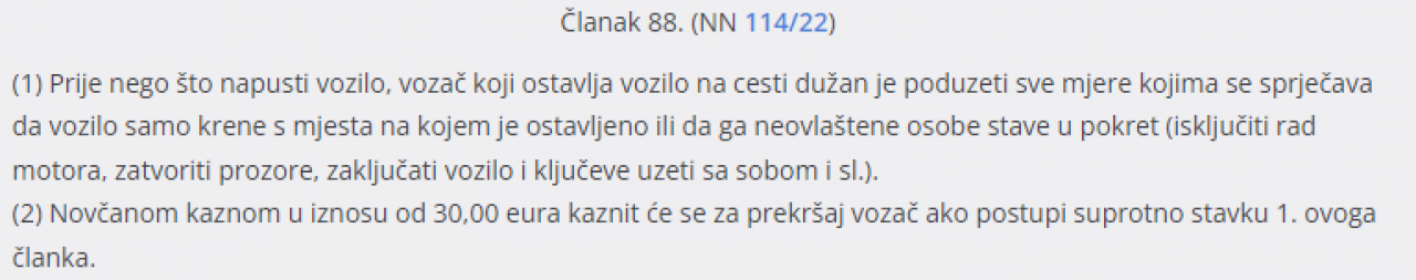 - Prije nego što napusti vozilo, vozač koji ostavlja vozilo na cesti dužan je poduzeti sve mjere kojima se sprječava da vozilo samo krene s mjesta na kojem je ostavljeno ili da ga neovlaštene osobe stave u pokret (isključiti rad motora, zatvoriti prozore, zaključati vozilo i ključeve uzeti sa sobom i sl.).
