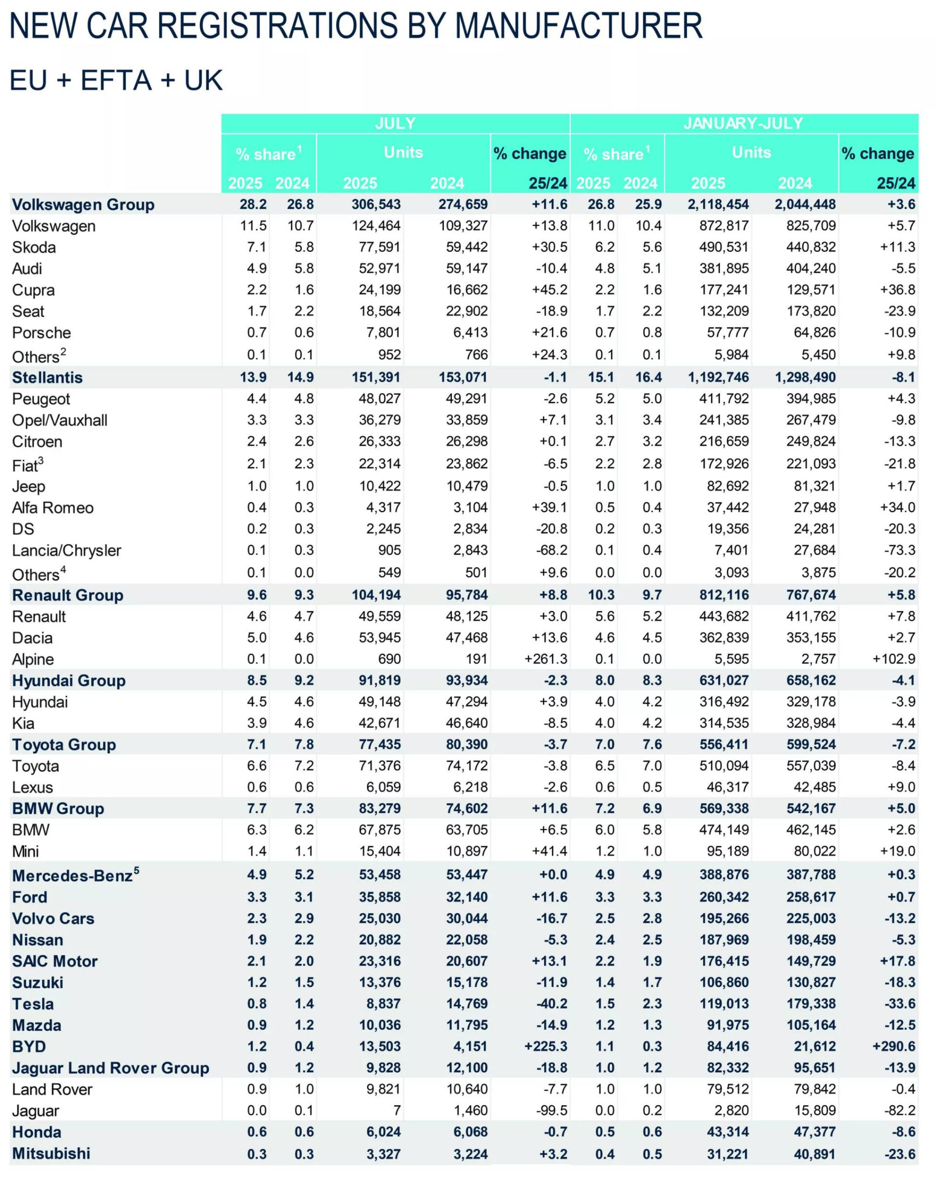 Najveći europski proizvođač, Volkswagen Grupa, i dalje drži vodeću poziciju s ukupno 2.118.454 registrirana vozila u razdoblju od siječnja do srpnja 2025., što je rast od 3,6 posto u odnosu na isto razdoblje prošle godine. Srpanj je bio posebno snažan mjesec za ovu grupaciju s rastom od 11,6 posto. Među markama u grupi, posebno se istaknula Škoda s rastom od čak 30,5 posto u srpnju i 11,5 posto kumulativno, kao i Cupra, koja bilježi +45,2 posto u srpnju i +36,8 posto tijekom godine. Volkswagen kao samostalna marka, ukupno je zabilježio porast od 5,7 posto u ovoj godini.