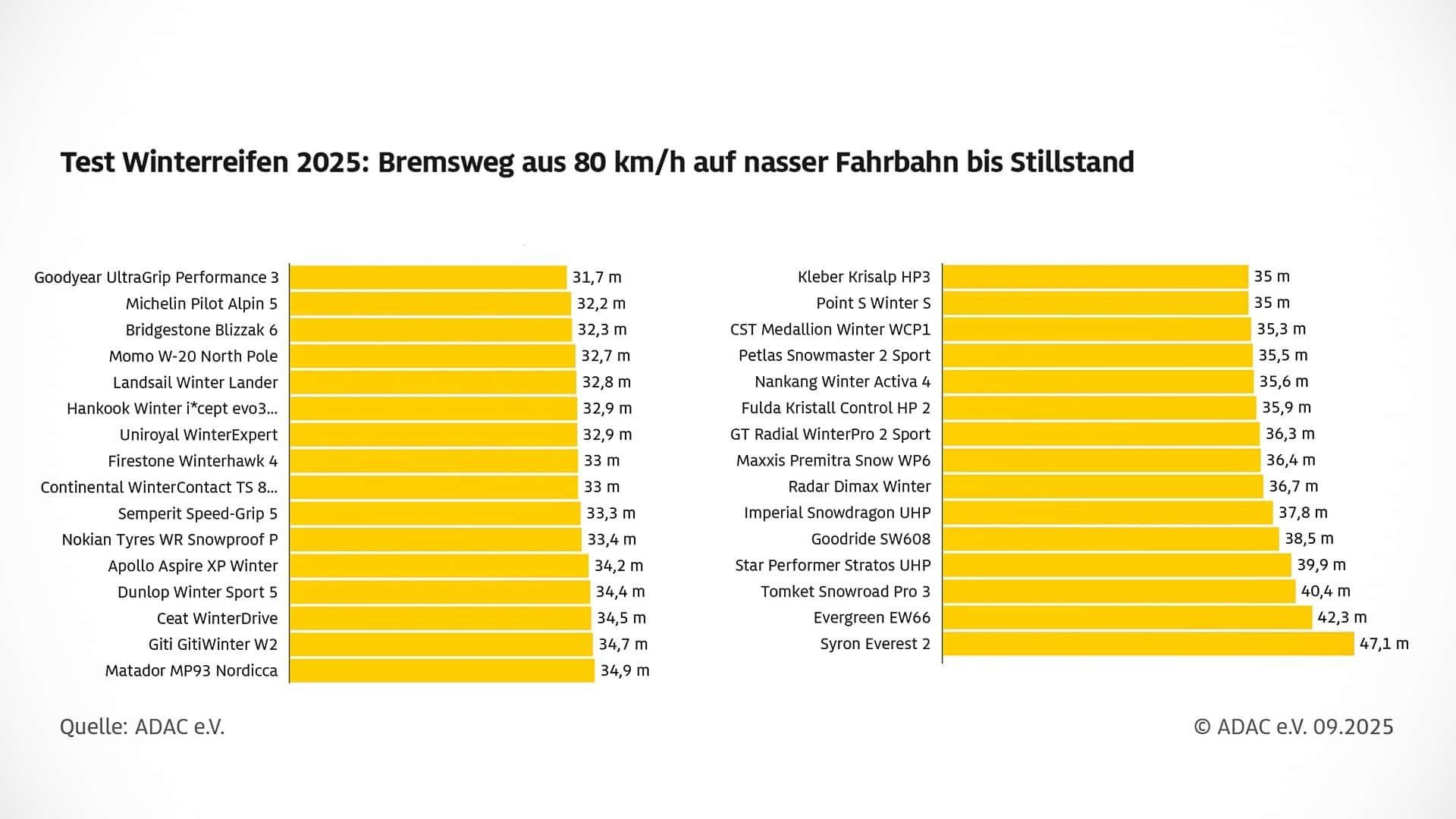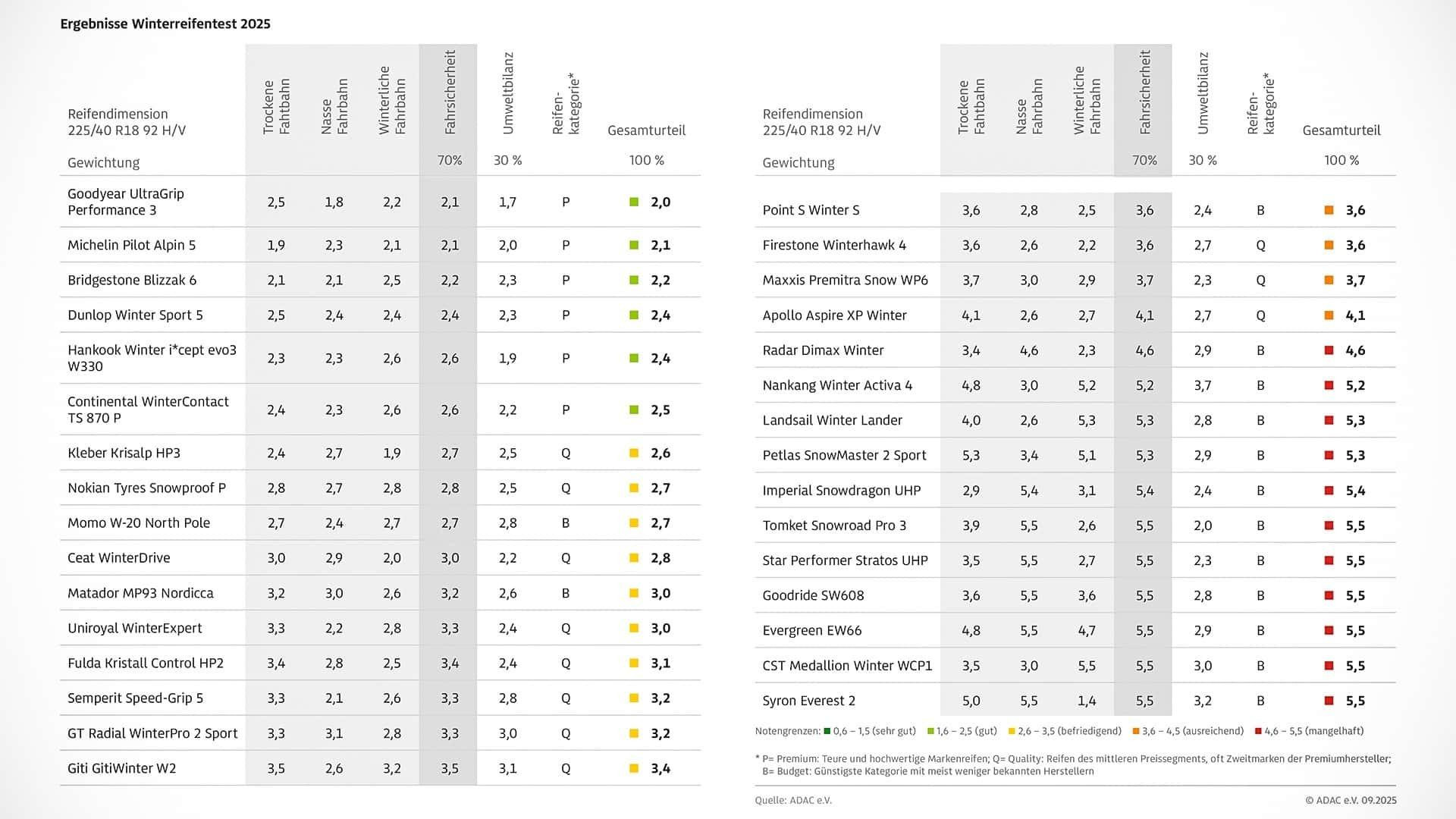 Na vrhu ljestvice našao se Goodyear UltraGrip Performance 3 s ukupnom ocjenom 2,0. Njegovi su aduti izvrsno ponašanje na mokroj podlozi i izvanredna trajnost, s procijenjenom mogućnošću prelaska više od 76.000 kilometara. Samo nijansu slabiji bio je Michelin Pilot Alpin 5 (2,1), dok su se Bridgestone Blizzak 6 i Dunlop Winter Sport 5 također dokazali kao sigurni i uravnoteženi izbori.