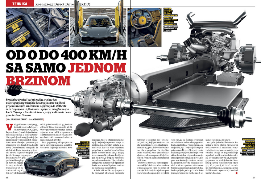 Švedski se dvosjedi već tri godine snalaze bez višestupanjskog mjenjača i oslanjaju samo na fiksni prijenosni omjer, ali svejedno uspijevaju do stotke stići za treptaj oka - 2,8 sekundi - i pojuriti vrtoglavih 400 km/h. Tajna je u tzv. direct driveu, kojeg sad koristi i novi gran turismo Gemera