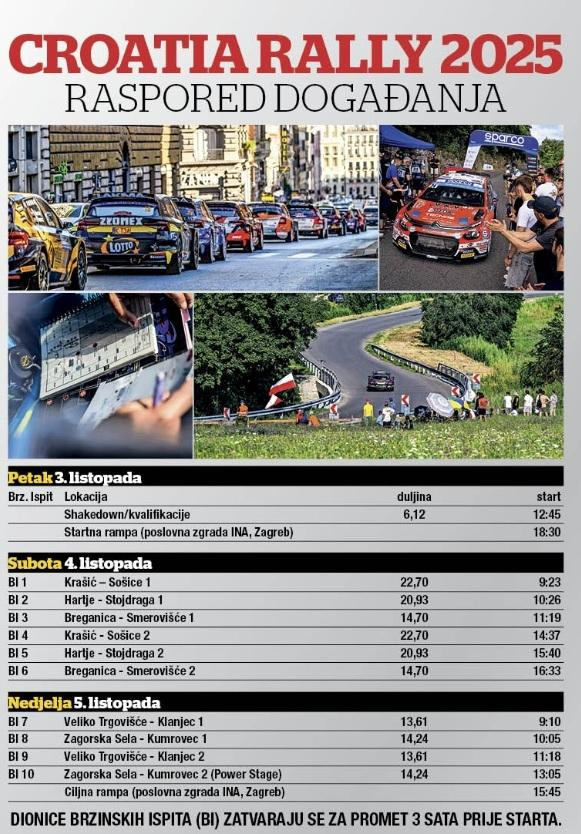 Uz ceremonijalni start i cilj u Zagrebu, publika će sudionike ovogodišnjeg Croatia Rallyja u najboljoj formi vidjeti tijekom dva natjecateljska dana. U subotu se vozi šest brzinskih ispita, a nedjeljna etapa ponudit će još četiri ispita.