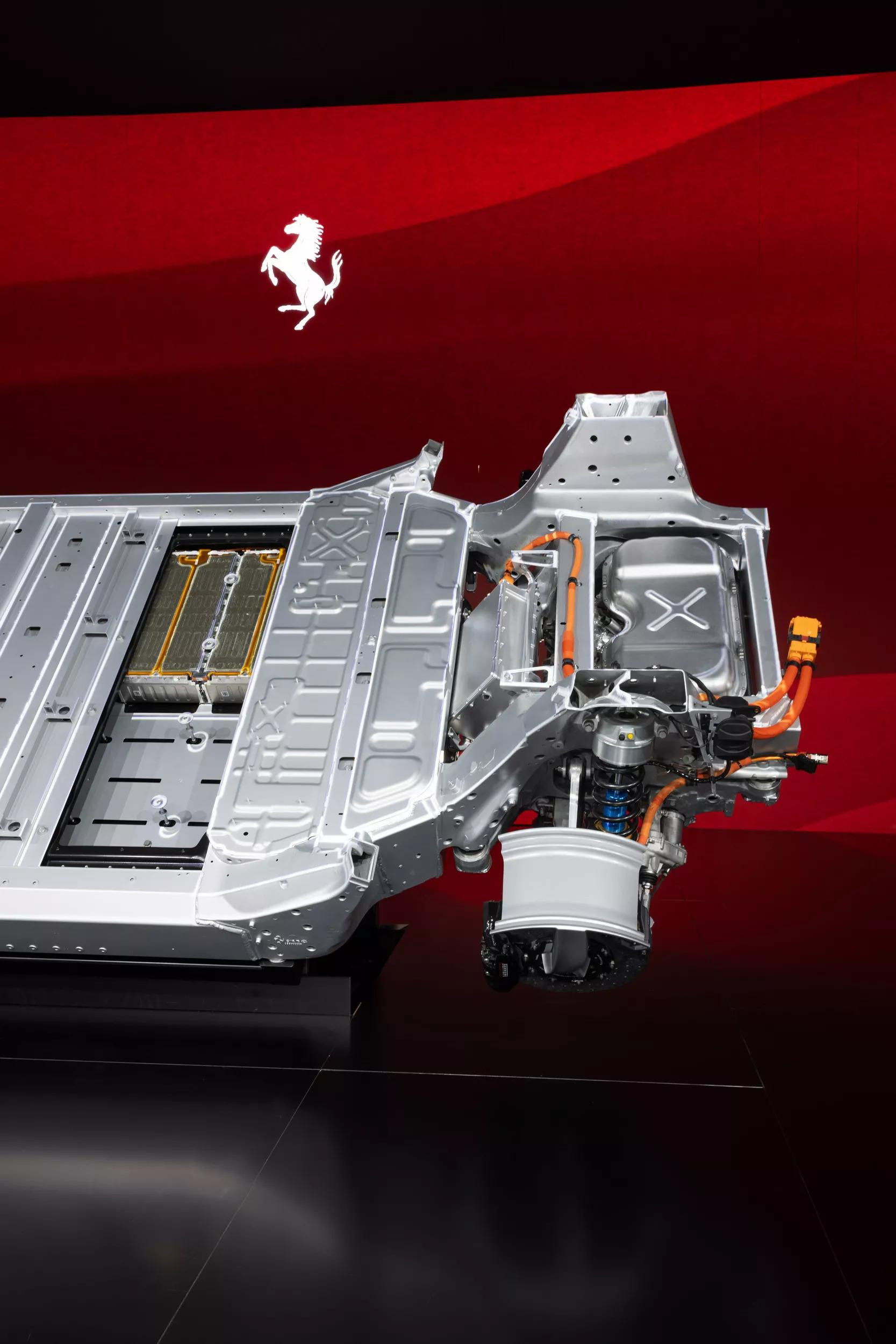 Električni model ima međuosovinski razmak od 296 cm, što, uz nisko težište, čak 8 cm niže nego kod benzinskih modela, osigurava iznimnu agilnost. Prvi put Ferrari koristi stražnji pomoćni okvir koji smanjuje buku i vibracije, a 48-voltnim aktivnim ovjesom osigurava istovremeno udobnost i preciznost u vožnji.