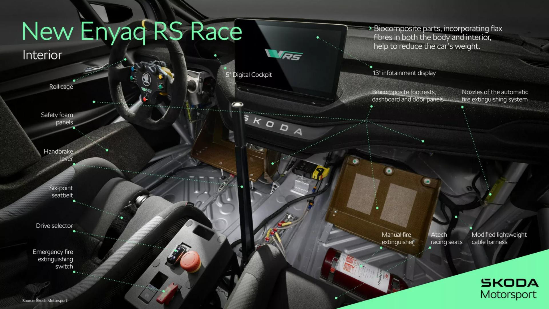 Ipak, ono što je još zanimljivije od brojki i izgleda jest materijal od kojeg je izrađena karoserija. Umjesto skupog i energetski zahtjevnog karbona, Škoda koristi biokompozit izrađen od prirodnog lana, u suradnji sa švicarskom tvrtkom Bcomp. Ovaj materijal, koji se koristi za izradu karoserijskih panela, krova, spojlera, pa čak i unutarnjih obloga vrata, lakši je i znatno ekološki prihvatljiviji. Emisije CO2 tijekom proizvodnje smanjene su za čak 85 posto u usporedbi s klasičnim karbonskim vlaknima, a pritom zadržava visoku čvrstoću.