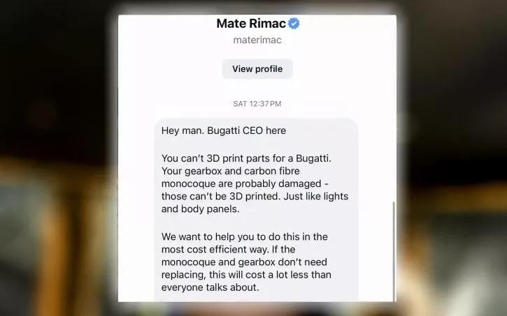 Bugattijev šef poslao je Gonzalezu privatnu poruku i odmah spustio loptu na zemlju. Objasnio je da 3D printanje dijelova za Chiron jednostavno nije moguće jer se ključni elementi poput mjenjača, karbonskog monokoka, svjetala i nosivih panela ne mogu se proizvesti tom metodom niti bi bili sigurni. Rimac je pritom prvi put potvrdio i razloge zašto je automobil uopće blokiran. Naime, postoji realna mogućnost da su mjenjač i šasija oštećeni, a bez njihove stručne provjere nema govora o popravku.