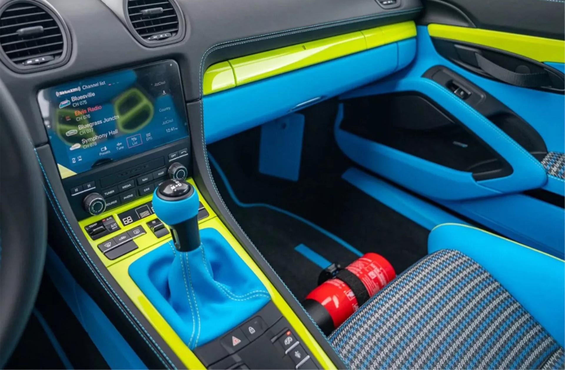 Na prvi pogled dominira jarko žutozelena karoserija, navodno nijansa Birch Green, koja sama po sebi i nije problem. GT4 RS ionako nije automobil za samozatajne, već ekstremna verzija Caymana namijenjena entuzijastima koji žele trkaći osjećaj na cesti. No tada tu dolaze plavi detalji i priča kreće u sasvim drugom smjeru.