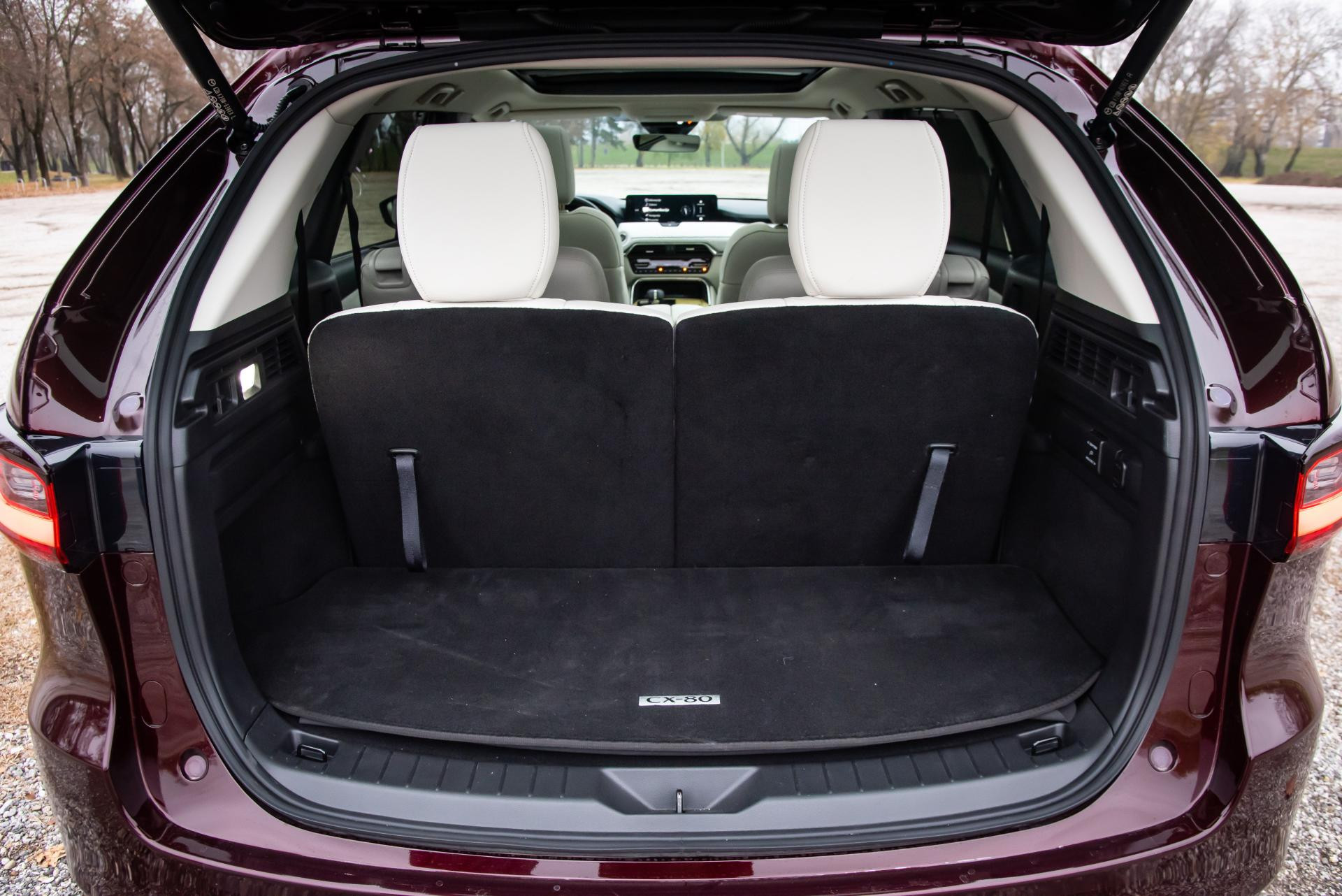 Veličina prtljažnika varira ovisno o poziciji sjedala: 258 litara kada su sva sjedala zauzeta, te 566 do 687 litara kada se srednji red pomakne prema naprijed. Treba spomenuti i da se stražnja bočna velika vrata otvaraju gotovo pod kutem od 90 stupnjeva za što lakši ulazak u fotelju. Sva sila elektroničkih pomagača, pritom, u vožnji objedinjena u sustavu Mazda Proactive Safety osigurava primjerenu sigurnost u vožnji. Uz čvrstu karoseriju, nimalo ne čudi što je CX-80 zaradio maksimalnih pet zvjezdica na EuroNCAP testu.