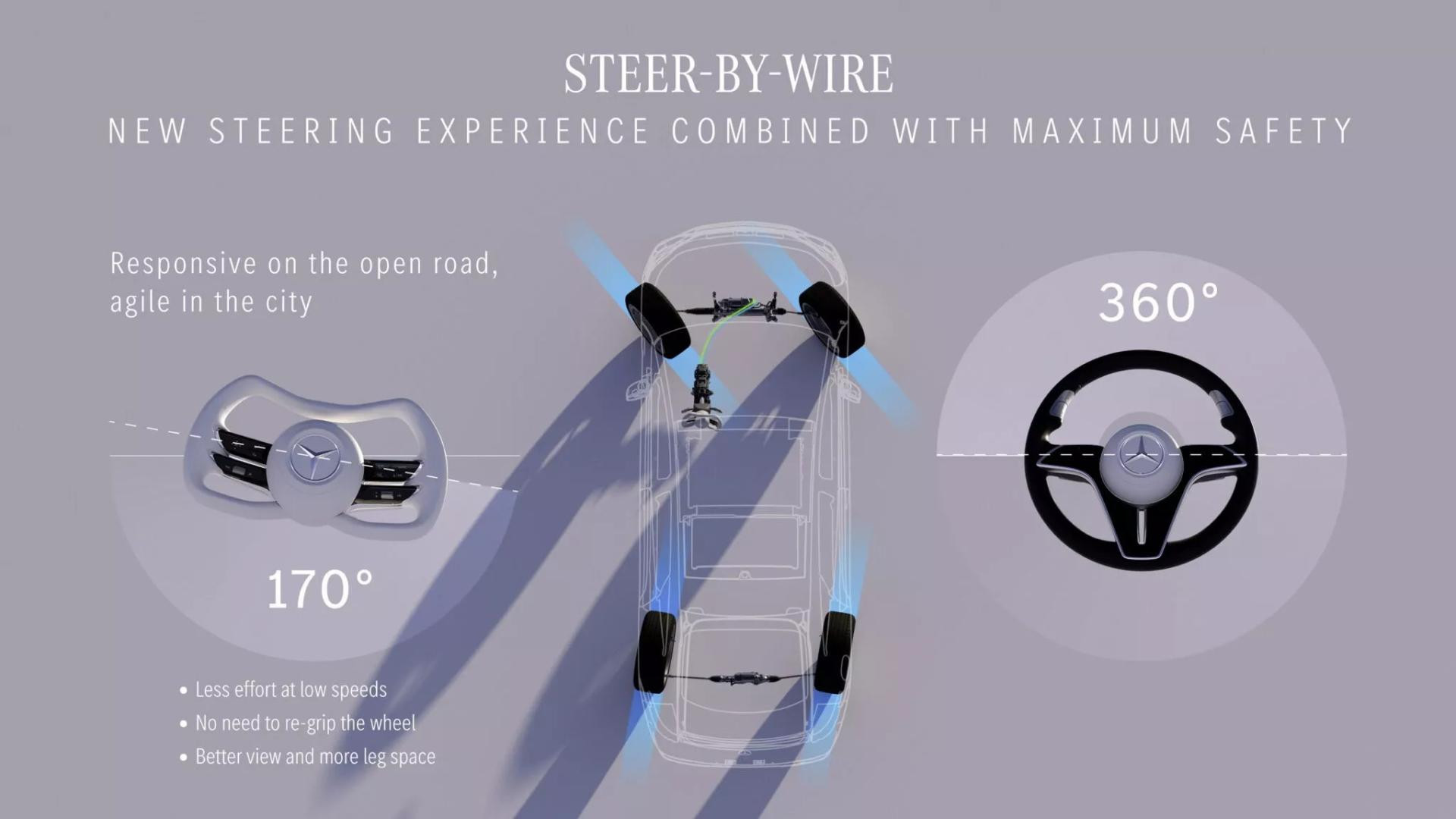 Prema Mercedesu, novi steer-by-wire sustav nudi "superiorne vozne karakteristike", odnosno osjećaj boljeg odziva na otvorenoj cesti i veću agilnost u urbanim okruženjima. Sustav je također dizajniran da olakša parkiranje, eliminirajući potrebu da vozač "mota" volan. Kao dodatni bonus, ovaj sustav je prilagodljiv različitim tipovima vozila i platformama.