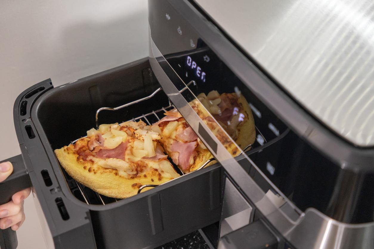 Zagrijte uređaj na oko 200°C, ubacite komad pizze i pecite 4 do 5 minuta, dok sir ne omekša, a rubovi ne postanu zlatno smeđi. Rezultat? Komad pizze koji je izvana savršeno hrskav, a iznutra mekan i sočan.