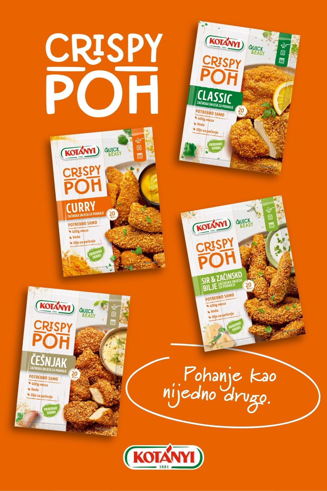 Crispy POH Classic savršen je za klasični pohanac poput Bečke šnicle, s blagim, uravnoteženim začinima. Crispy POH Curry ima tople, aromatične note orijentalnih začina uz blagu pikantnost, dok Crispy POH Češnjak ima intenzivniji okus, hrskavu teksturu i bogatu aromu. Za sve one koji vole pohance blažeg okusa, Crispy POH Sir i začinsko bilje ima sjajnu kombinaciju sira i aromatičnog mediteranskog začinskog bilja pa se najbolje slaže s piletinom ili ribom.