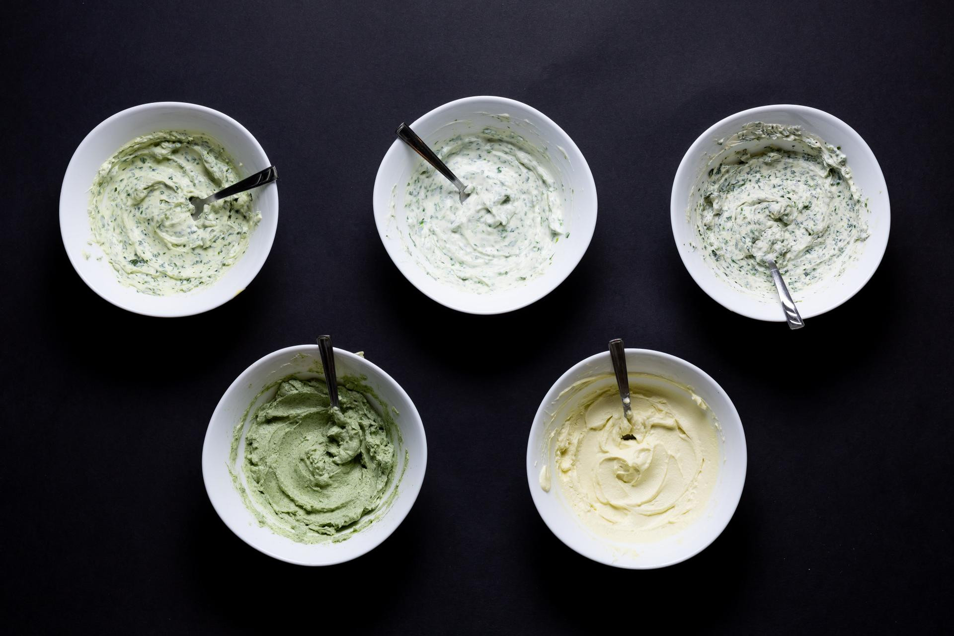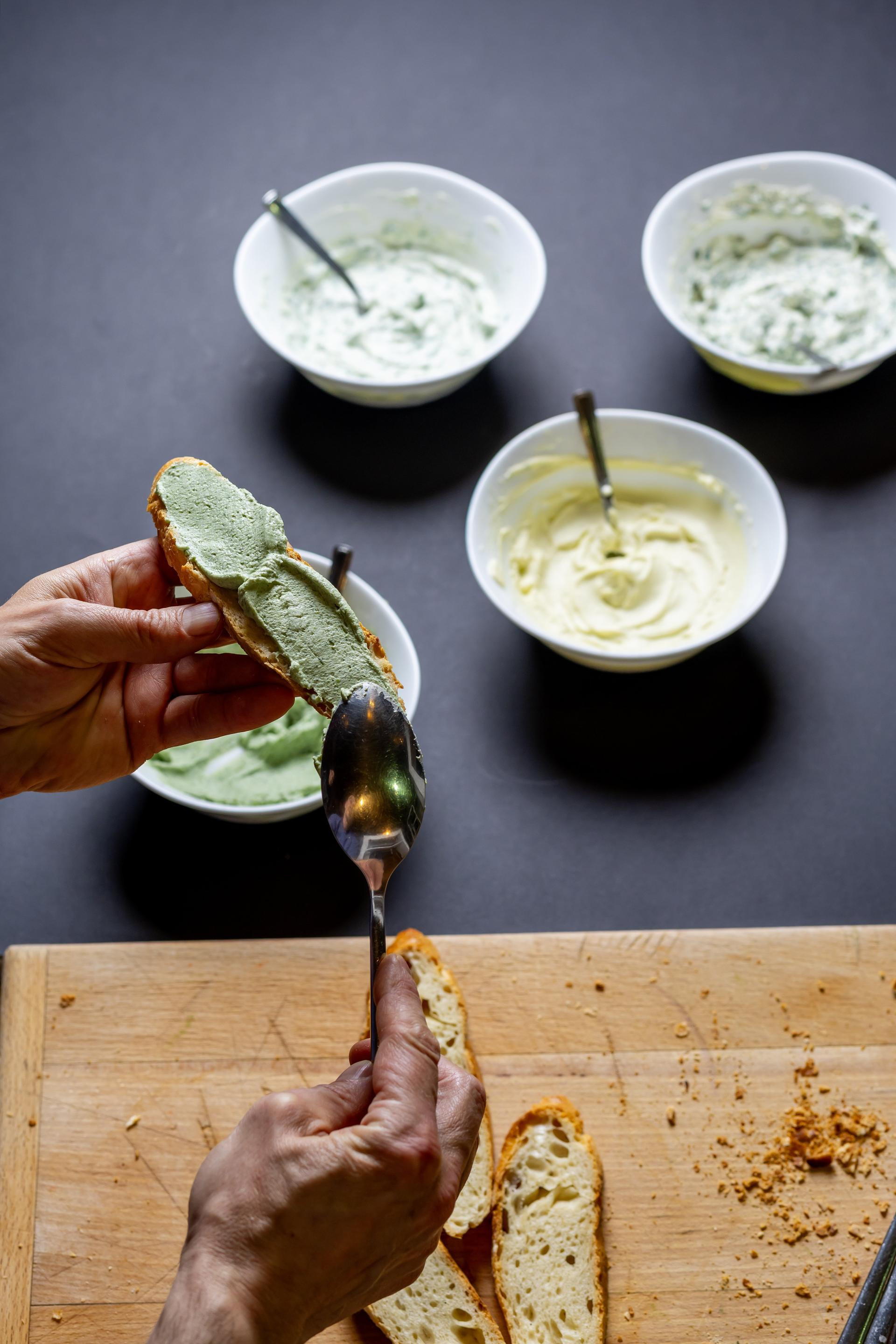 Kako bismo stavili različite varijante obrade medvjeđeg luka na test, odlučili smo s njima pripremiti kremaste mliječne namaze. Zamiješali smo u multipraktiku po namazu bazu od 100 g sira ricotta, 25 g maslaca sobne temperature i 2 g soli i u nju smo dodali svježi, blanširani i medvjeđi luk u prahu te ulje aromatizirano medvjeđim lukom. Osim te četiri vrste namaza, pripremili smo i petu varijantu kojoj smo dodali medvjeđi luk kratko zapečen na roštilj tavi. Budući da je maslac bio sobne temperature, stavili smo namaze kratko u hladnjak da se stegnu, dobro ih izmiješali, namazali na kruh i kušali da vidimo što smo dobili i koji nam se najviše sviđa.