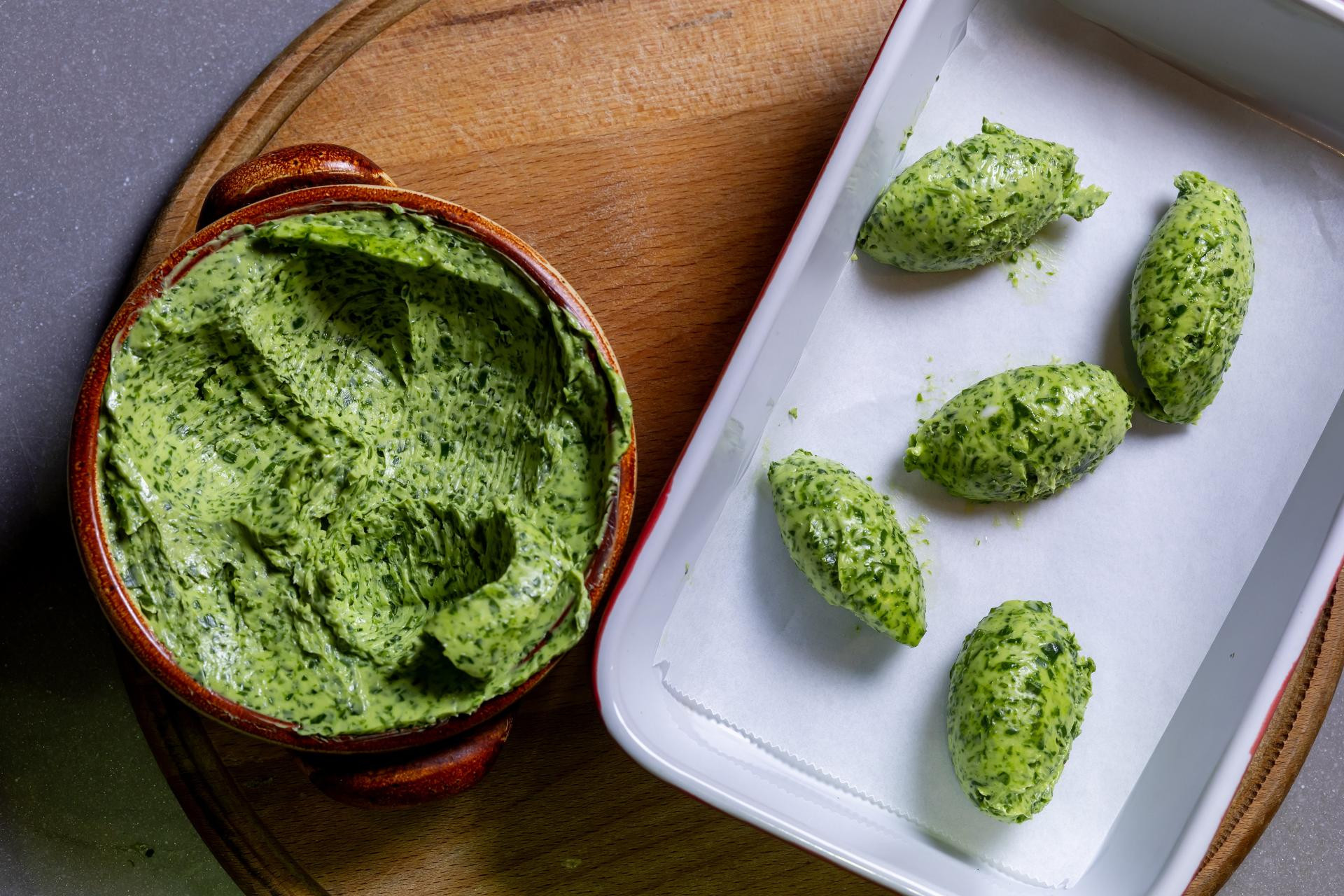 Usitnite 100 g svježeg medvjeđeg luka i dodajte mu 250 g maslaca sobne temperature. U posudi ga ručnim mikserom razradite tako da se sastojci povežu. Poravnajte dobiveni maslac u posudi, uzmite željenu veličinu žlice, stavite je u vruću vodu pa potegnite kroz maslac prema sebi, zatim okrenite žlicu prema van i oblikujte žličnjak od maslaca. Držite ga tako porcioniran u hladnjaku pa ga koristite uz steakove. Želite li ga zamrznuti, u posudu koju ste prekrili papirom za pečenje slažite žličnjake od maslaca sve dok ne potrošite smjesu. Dobivene žličnjake prekrijte neprianjajućom folijom pa stavite u zamrzivač. Kad se smrznu, prebacite ih u vrećicu ili posudu, pospremite ih i koristite po želji.