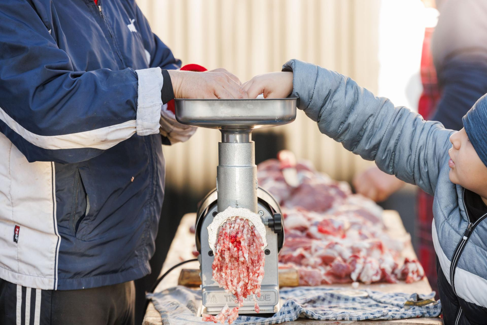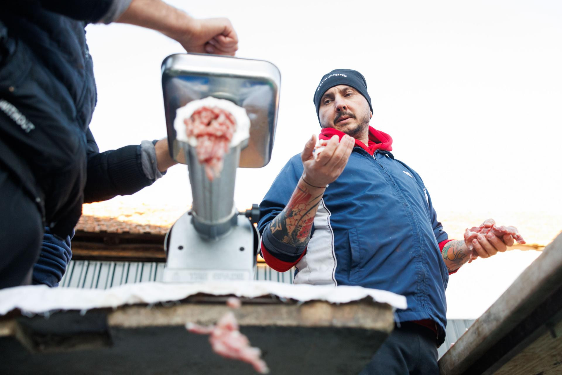 "Meso se raširilo i ohladilo i sada je vrijeme za mljevenje", kazao nam Goran, već spreman za akciju. Određeni dijelovi kostiju, glave, bubrezi, obrazi i kožica već su ostavljeni za hladetinu, kao i masniji dijelovi trbuha - sve se to skuhalo, nakon čega se dio za krvavice sitno melje, a onaj za švargle prolazi kroz krupnu rešetku.