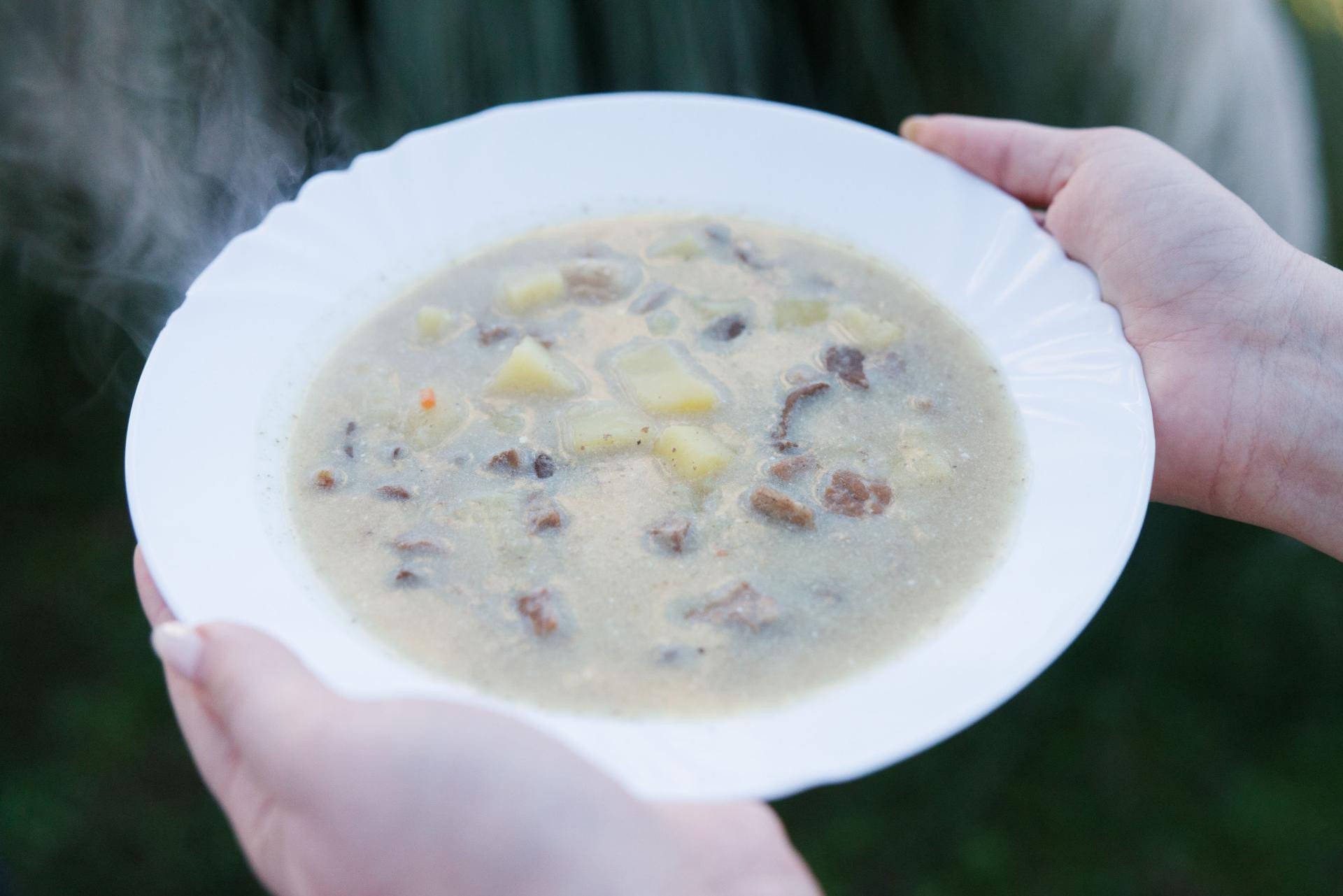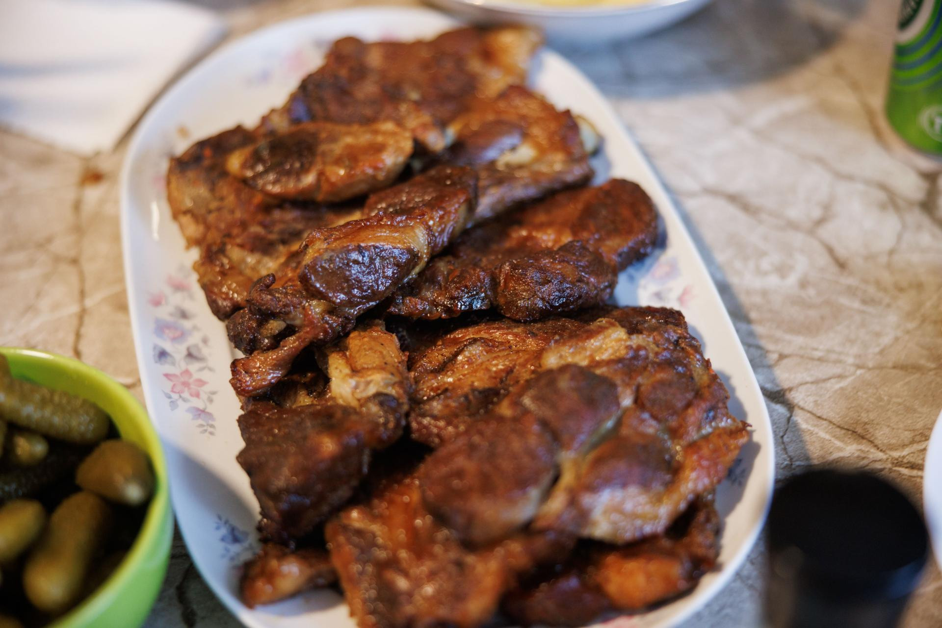 Dok su se muškarci bavili tranširanjem svinja, a pečenje čvaraka bilo u zadnjoj fazi, mi smo odlučili otići u kuću i posjetiti članice obitelji koje su pripremale ručak. Na stolu su nas još čekali ostaci doručka - jetrica, langošice i kobasice, dok se tik do njih dizalo tijesto za salenjake. Kuhala se tu već i kisela čorba koja se radi od nekih vrsta iznutrica, s tim da naši domaćini preferiraju jetrica i sitno meso. Tu su i rebrica i ostali komadi mesa koji će se odmah peći i pripremiti za ručak uz pire-krumpir i domaću kiselinu - paprike, krastavce...