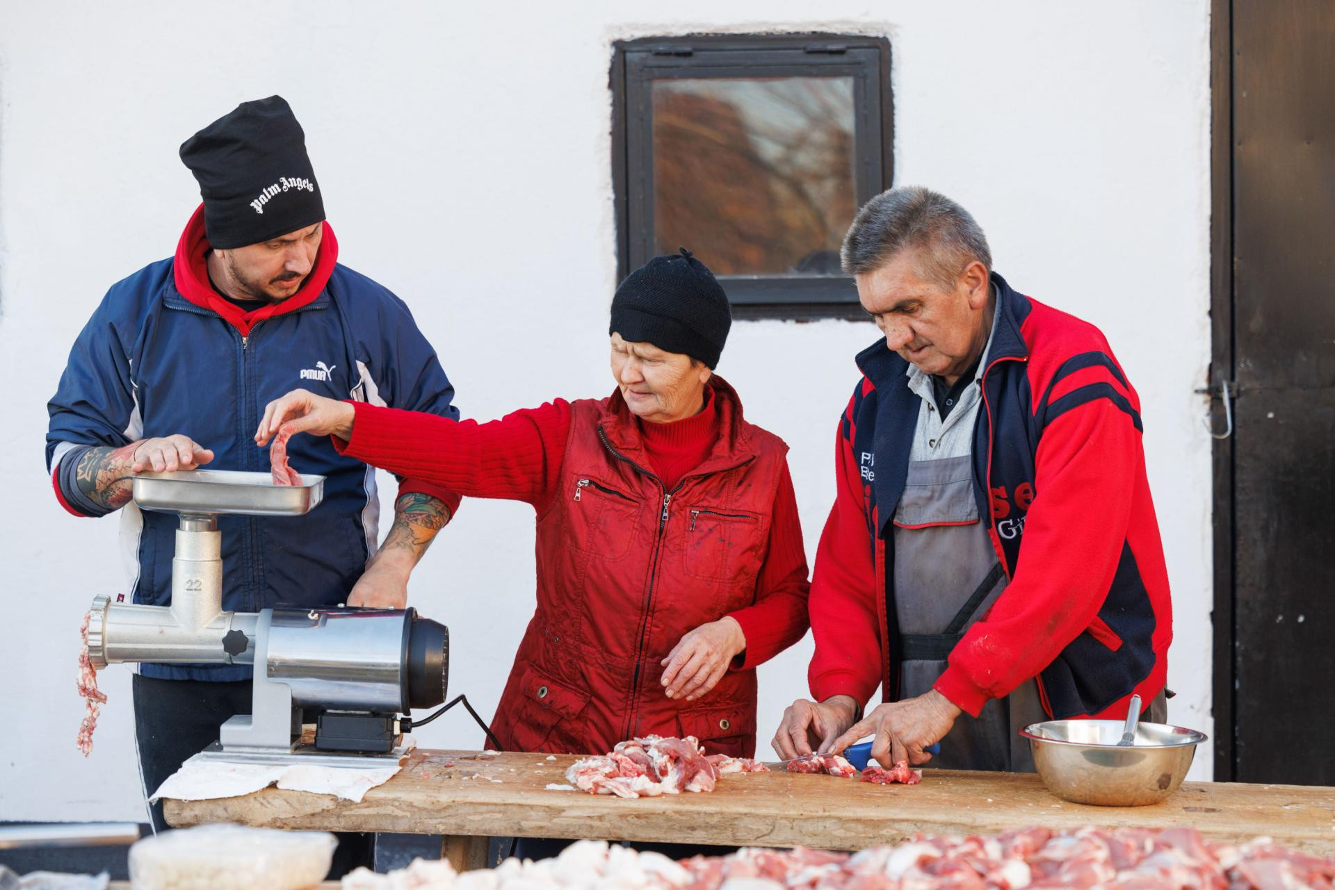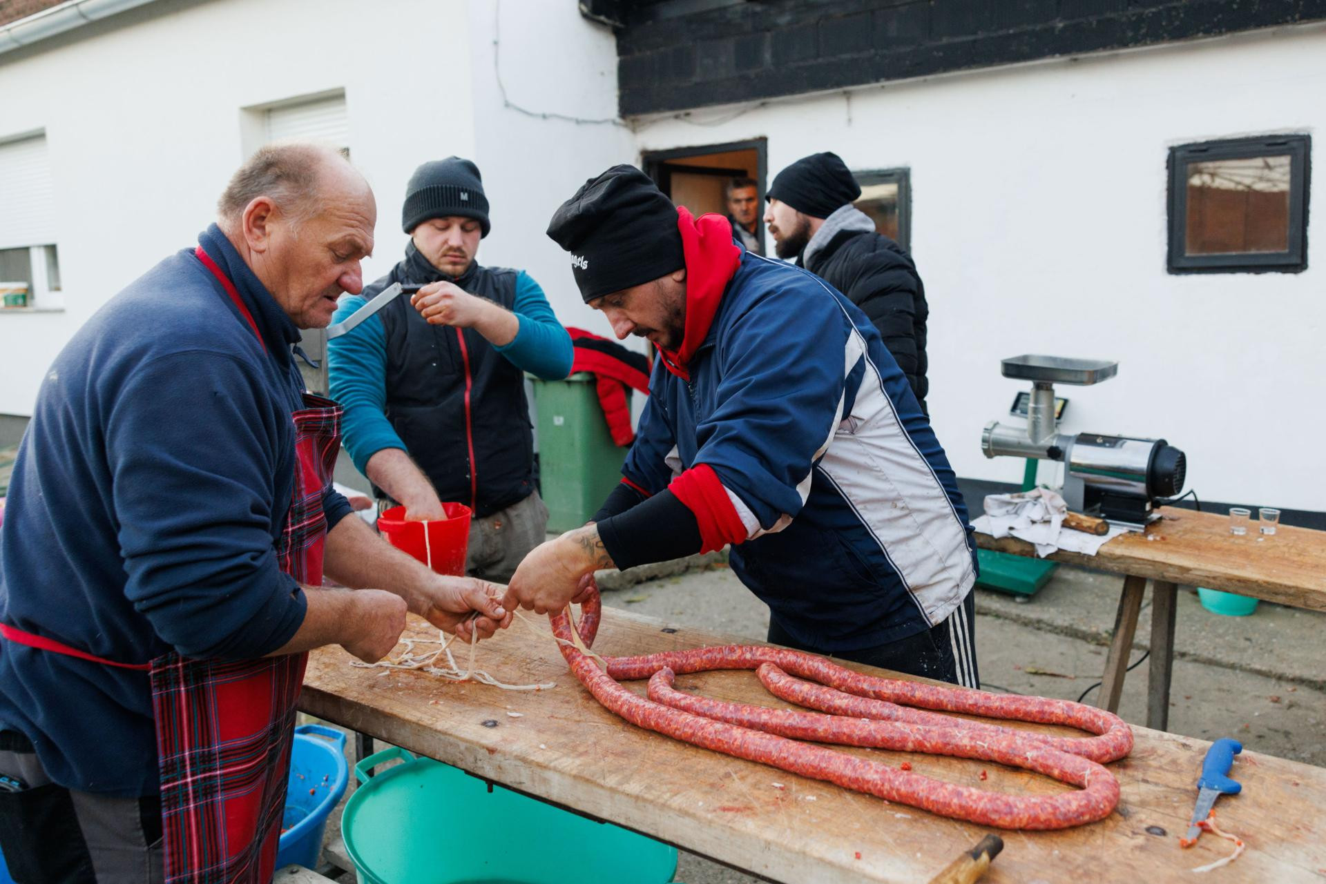 Kočiševa supruga zajedno sa sinom pomagala je u čišćenju crijeva, mljevenju mesa i na kraju punjenju nizova kobasica začinjenih domaćom baranjskom i slavonskom mljevenom paprikom. "Plećke i ostaci drugog mesa melju se te se dodaje dva posto soli, 0,3 posto ljute paprike i 0,5 posto slatke", objašnjava nam Goran dok stručno mota metre i metre kobasica. Suhomesnatih proizvoda, kaže, naprave dovoljno za cijelu godinu, a svježim se mesom opskrbe tek za određeni dio.