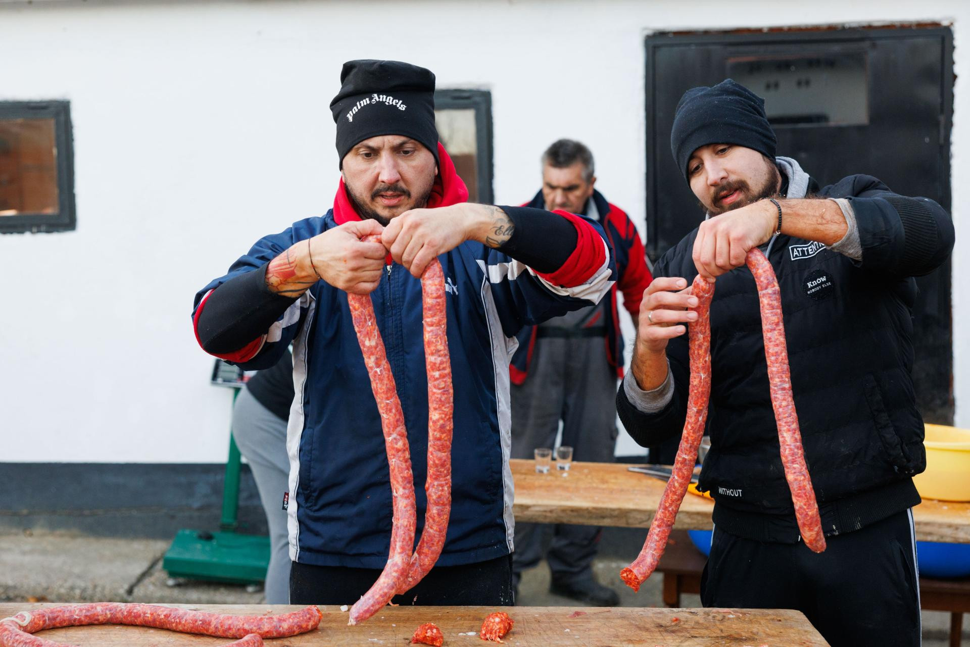 Na sreću nekih, a možda na nesreću drugih, čini se da će i ovoga puta biti pošteđeni pravog krimića, jer su Slavonci "prljavi" posao obavili ranom zorom, a dvije nemale svinje - svaka teža od 200 kilograma žive vage - već su tranširali na velikim drvenim stolovima dok su zvuci tamburice odjekivali iz zvučnika. Domaćin Goran Kočiš dočekao nas je u izdanju u kojem ga nismo naviknuli gledati. Radna odjeća zamijenila je bijelu kuharsku kutu i fina odijela, a njegove ruke, umjesto da nam prezentiraju slow food, bile su duboko zaronjene u naslage mesa koje je čekalo obradu. Kum, bratić, nećak, otac... svi muškarci jedan uz drugoga naslonjeni na stolove tranširali su svinjske polutke, rebra, krojili slanine...
