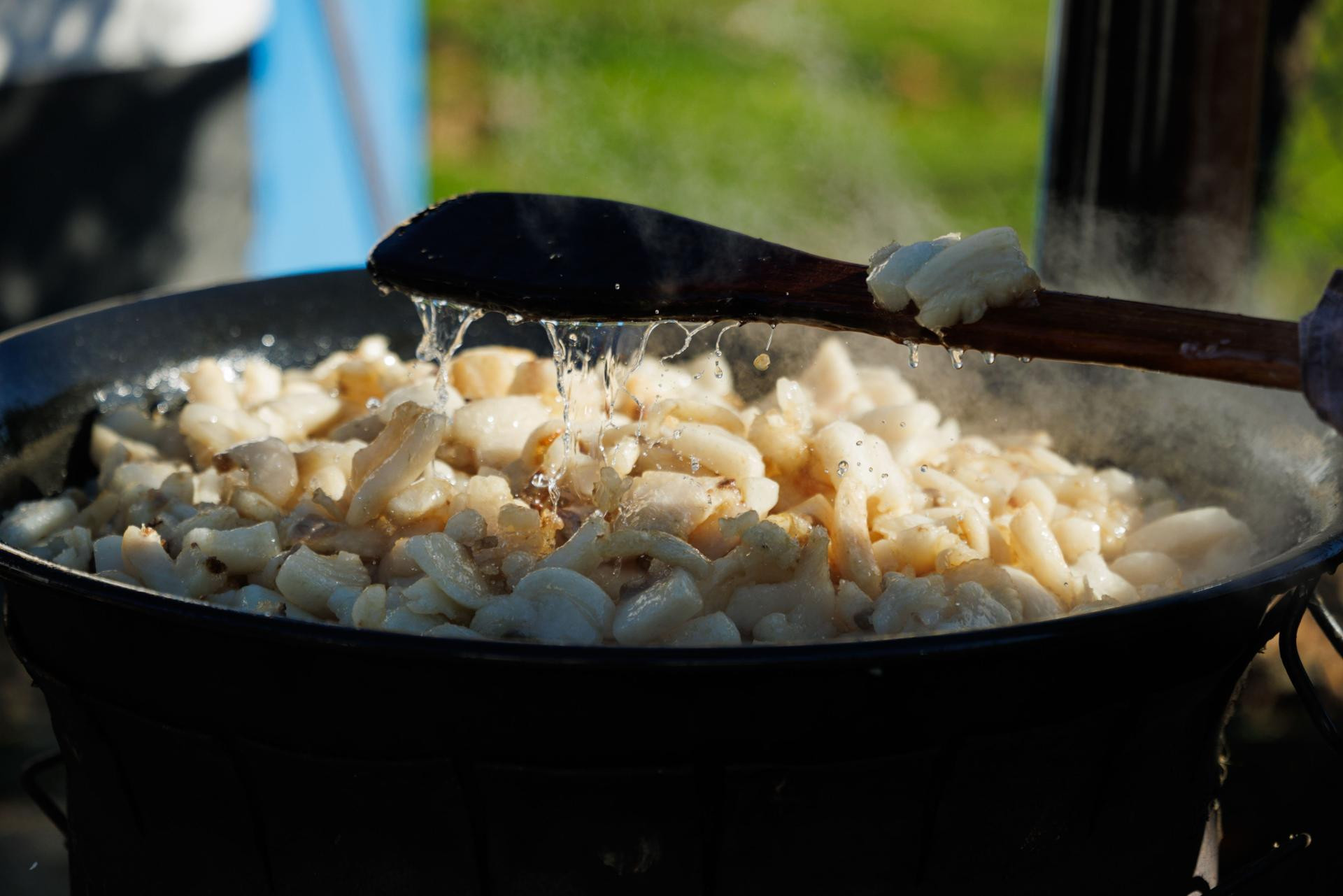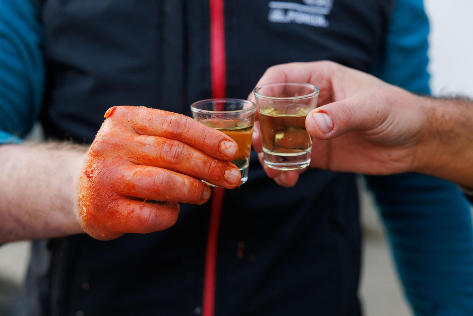Ustajemo od stola u nadi da su barem čvarci pri kraju, jer valjalo bi nešto prigristi i prije ručka. Nakon što su se pekli dobra dva, dva i pol sata uz stalno miješanje, čvarci su bili spremni za cijeđenje, nakon čega ih je čvrsta ruka Gorana Kočiša prešala i pretvarala savršene paketiće masti u čips. Hrskavima i vrućima, teško će im odoljeti čak i oni kojima svinjetina nije prvi izbor kada je gastronomija u pitanju. Dok smo uz već nebrojenu zdravicu kušali čvarke, žene su naredile obustavu radova - ručak je bio na stolu.