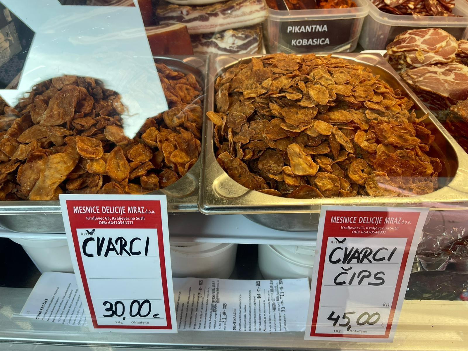 Nedaleko Kudelića, u mesnici Agrozelina potvrđuju nam kako imaju čvaraka, a cijena po kilogramu iznosi 20 eura. Na istoj tržnici, u mesnici Mraz cijena iznosi 30 eura po kilogramu, dok je cijena čips čvaraka, onih tankih, hrskavih i slasnih, čak 45 eura po kilogramu.