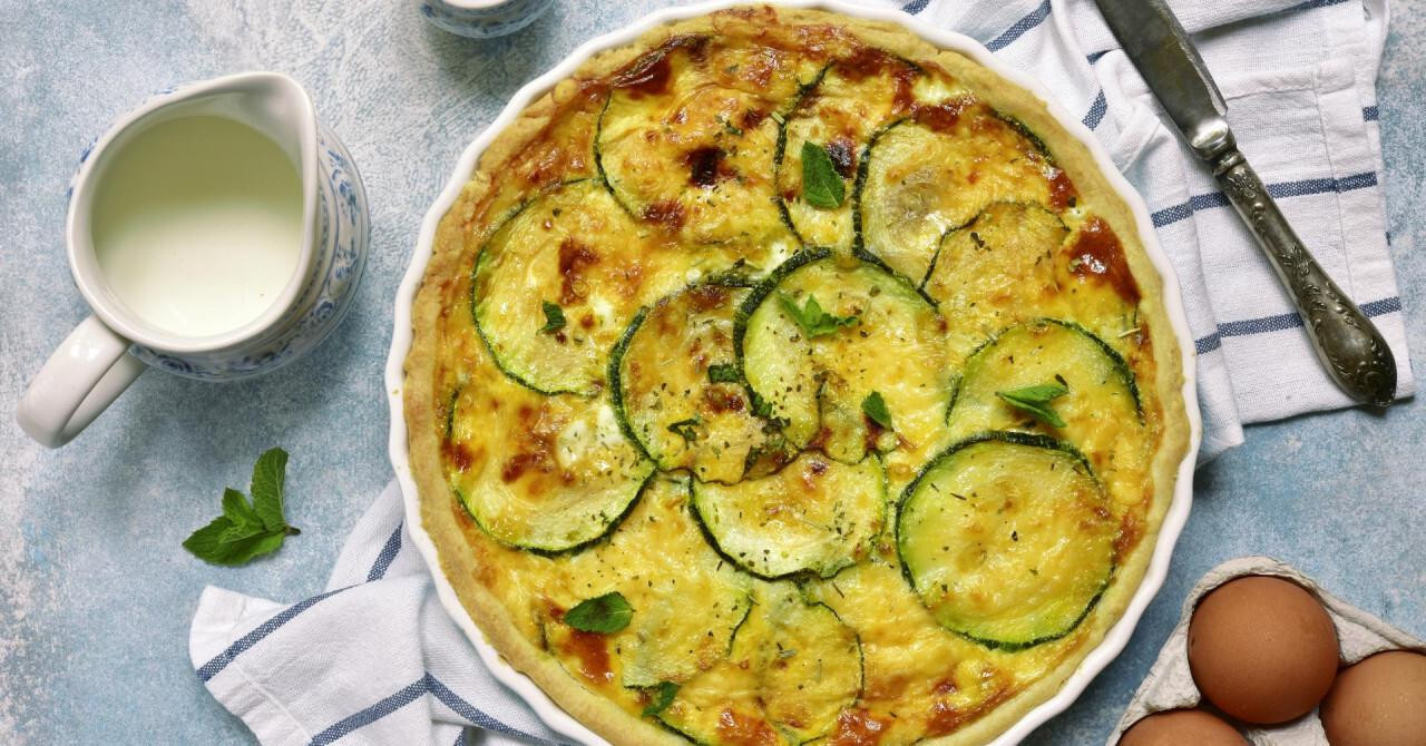 Razvaljajte lisnato tijesto i stavite ga u kalup za pečenje. Tikvicu narežite na tanke kolute. U zdjeli izmiješajte jaja, vrhnje, sol i papar, dodajte šunku i sir. Smjesu prelijte po tijestu i rasporedite tikvice po vrhu. Pecite u pećnici zagrijanoj na 180 °C oko 30 minuta dok ne dobije zlatnu boju. Poslužite toplo.