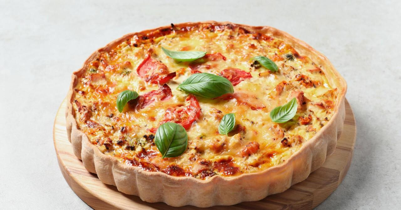 Pećnicu zagrijte na 180 °C. Tijesto razvaljajte i stavite u kalup za pitu, pa izbockajte vilicom. U zdjeli pomiješajte jaja, vrhnje, ribani sir, sol i papar. Cherry rajčice prerežite na pola, a bosiljak nasjeckajte. Ulijte smjesu u kalup, rasporedite rajčice i bosiljak na vrh. Pecite 35 minuta dok quiche ne postane zlatno-smeđi. Ostavite da se malo ohladi prije posluživanja.