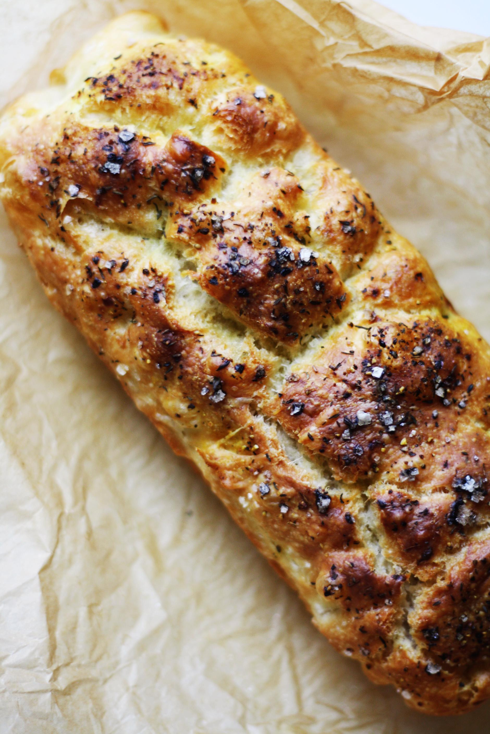Od brašna, vode i kvasca napravite tijesto i pustite da stoji 20 minuta. Dodajte sol i ulje, zamijesite tijesto i pustite da se diže 40 minuta. Tijesto zatim uhvatite rukama za dva kraja i preklopite ga. Prekrijte krpom i dižite još 40-ak minuta ili dok se ne digne. Laganim pokretima ponovno ga dignite, ali ovaj puta tako da dobijete štrucu. Pazite da ne istisnete previše mjehurića koji su se napravili na površini. Stavite ga u kalup za kruh koji ste obložili papirom za pečenje i poprskali maslinovim uljem. Poklopite. Upalite pećnicu na 200 stupnjeva. Dok se pećnica grije, neka se kruh još malo diže, oko 20 minuta. Zatim ga poprskajte s malo maslinova ulja, prstima napravite udubine, dodajte začine po vrhu i pecite 30-40 minuta ili dok kruh ne poprimi lijepu, zlatnu boju.