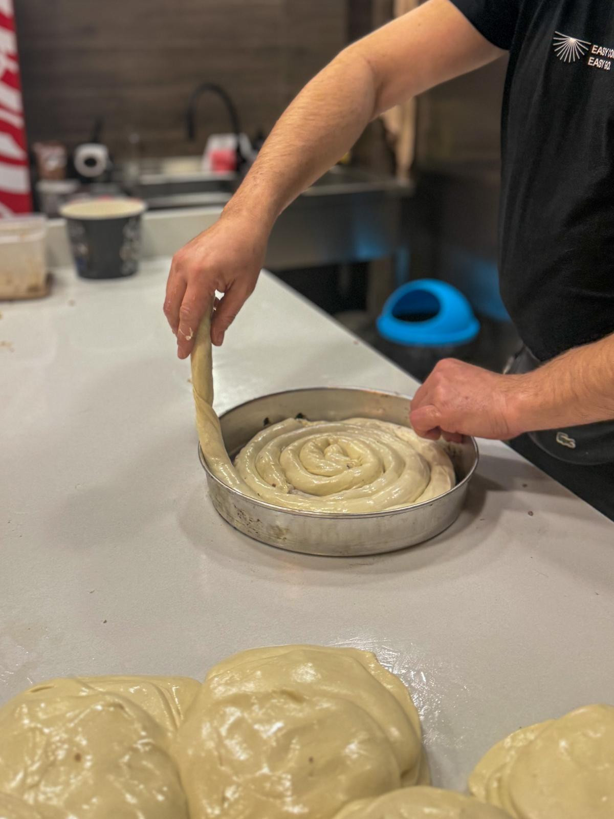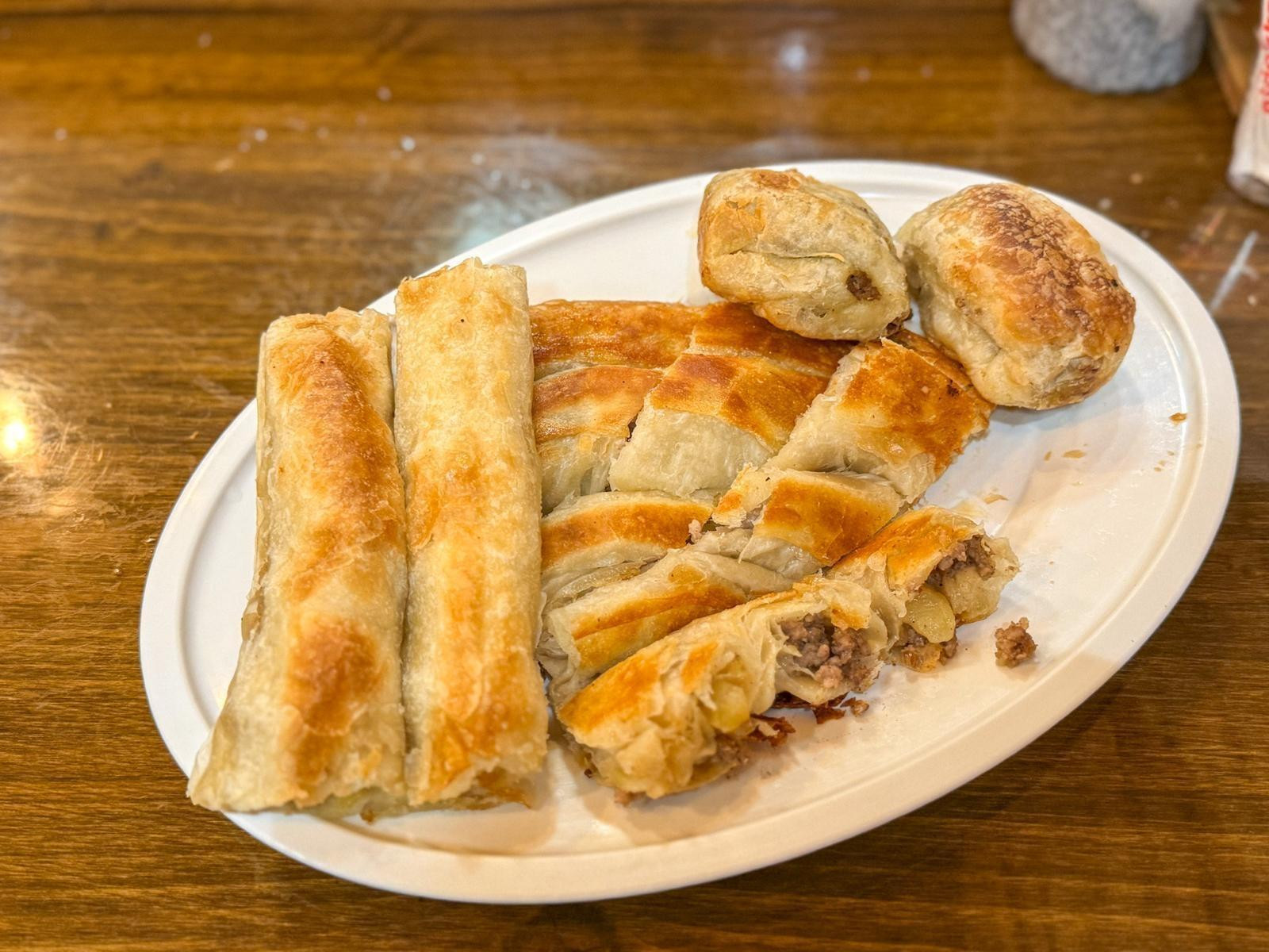 Shatri cijeli dan ručno slaže pite, a gledati ga pri poslu poučno je na način na koji to znaju biti zanatski procesi kada ih izvodi netko tko ih dobro poznaje. Tijesto, naravno, spremaju na licu mjesta. Meso koje koriste je stopostotna junetina s manjih farmi u Slavoniji, detalj koji rado ističu jer se zaista osjeća u kvaliteti.