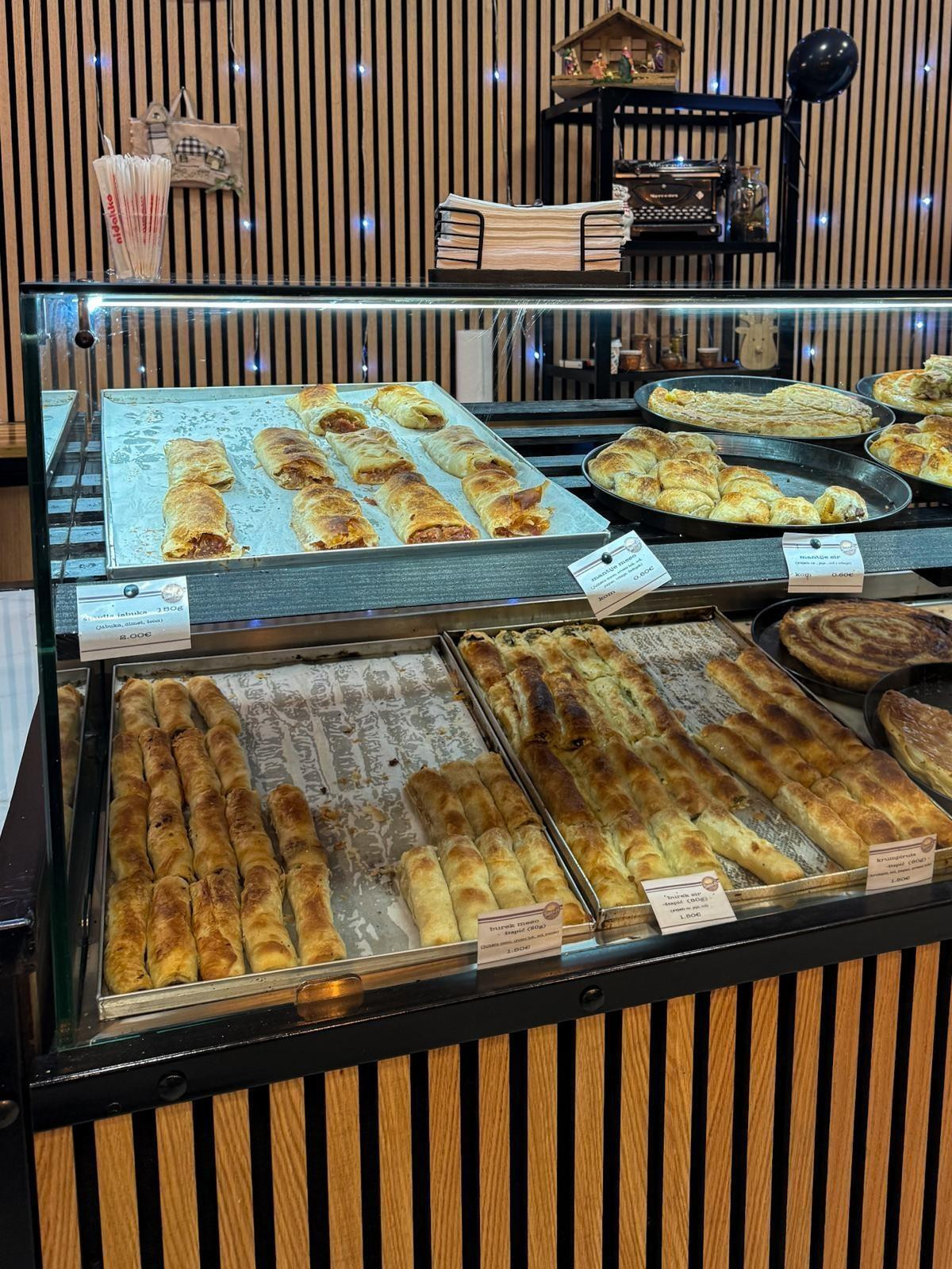 Ponuda lokala uključuje klasične varijante pita: s mesom, zeljanicu, sa sirom, šareni burek koji kombinira meso i sir, te različite oblike u trokutu i manjim komadima. Cijene se kreću od 1,50 eura za štapić do 4 eura za veće komade. Pite peku kontinuirano tijekom dana, što znači da su stalno tople; ni jedan komad koji smo probali nije bio hladan.