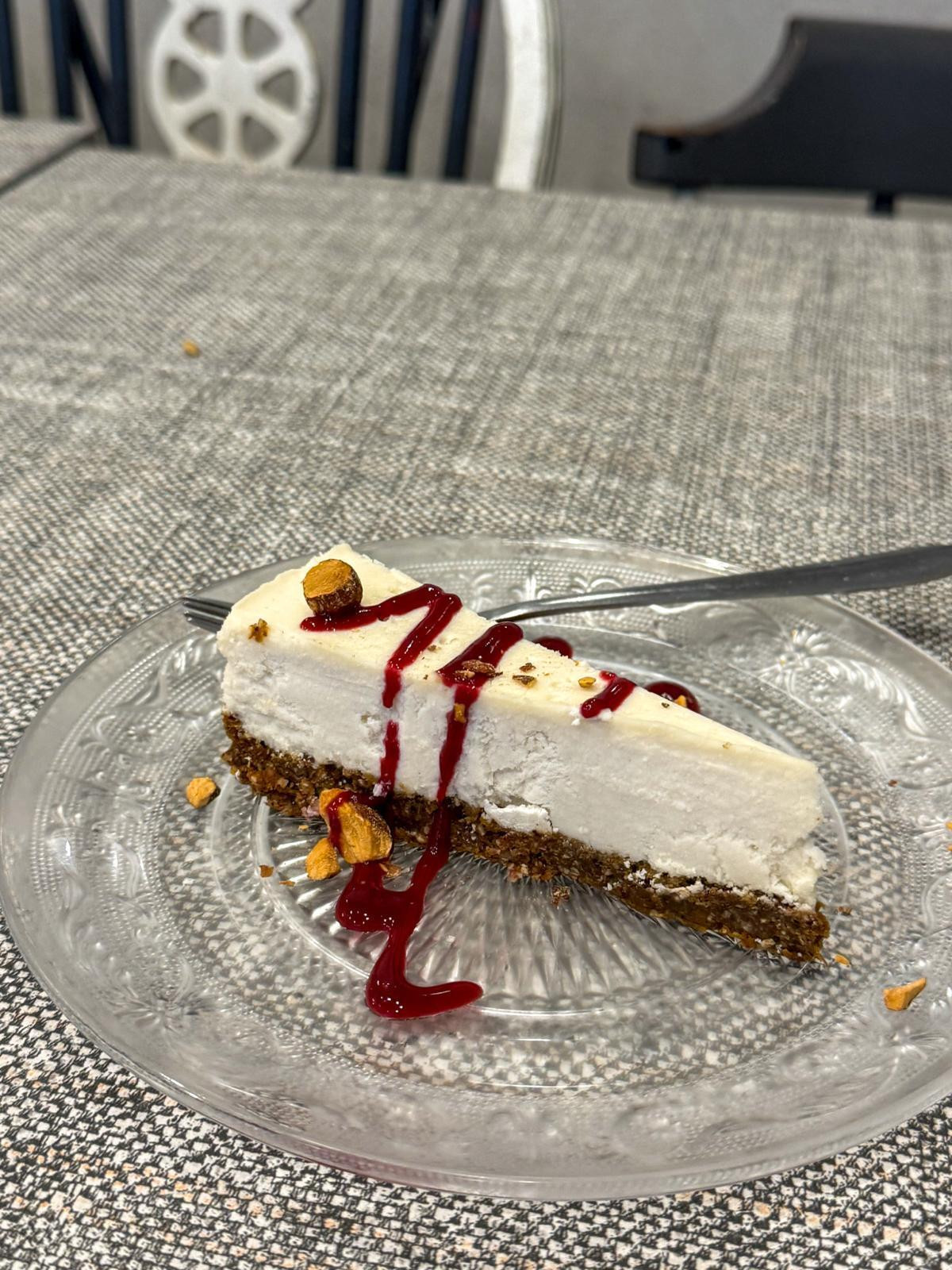 Za kraj ranog ručka, odnosno gableca, kušali smo i njihovu novu, polusirovu tortu od kokosa s voćem (4,70 eura), uz koju nam se jako svidio coulie od sezonskog voća sa sirupom od bazge, koji je bio preliven preko kolača.