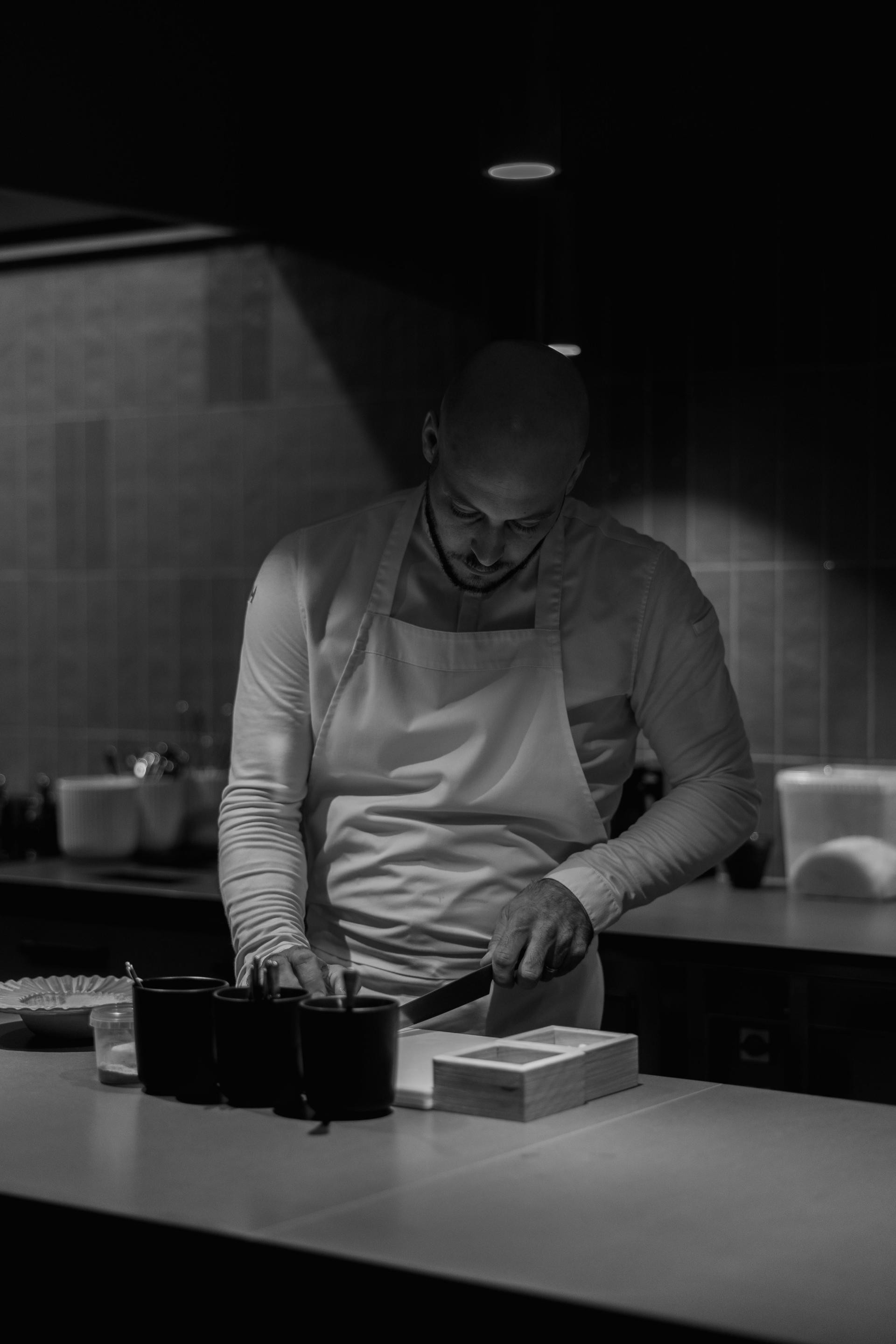 Kad govori o kuhinji i jelima iz svog restorana posebno ističe jedno nakon snackova, koje su - prema njegovim riječima - od ožujka do danas promijenili već desetak puta. Spominje to zato da naglasi koliko je važno pratiti sezonalnost namirnica, a ne godišnjih doba. Nadalje, ističe nam i uvodni zalogaj kao jedino jelo koje se nije mijenjalo od početka. Riječ je o snacku koji otvara večeru u obliku jadranskih kozica koje mariniraju u otopini maraschina, potom stavljaju u hrskavu košaricu kao mali tartlet, zatim dodaju fermentirane trešnje koje rastu u vrtu njegova kolege Baraća. Potom se u jelo dodaje i njihov domaći mascarpone te se cijeli zalogaj zatvara lepezom od ukiseljene korabe te povrh toga kavijar.