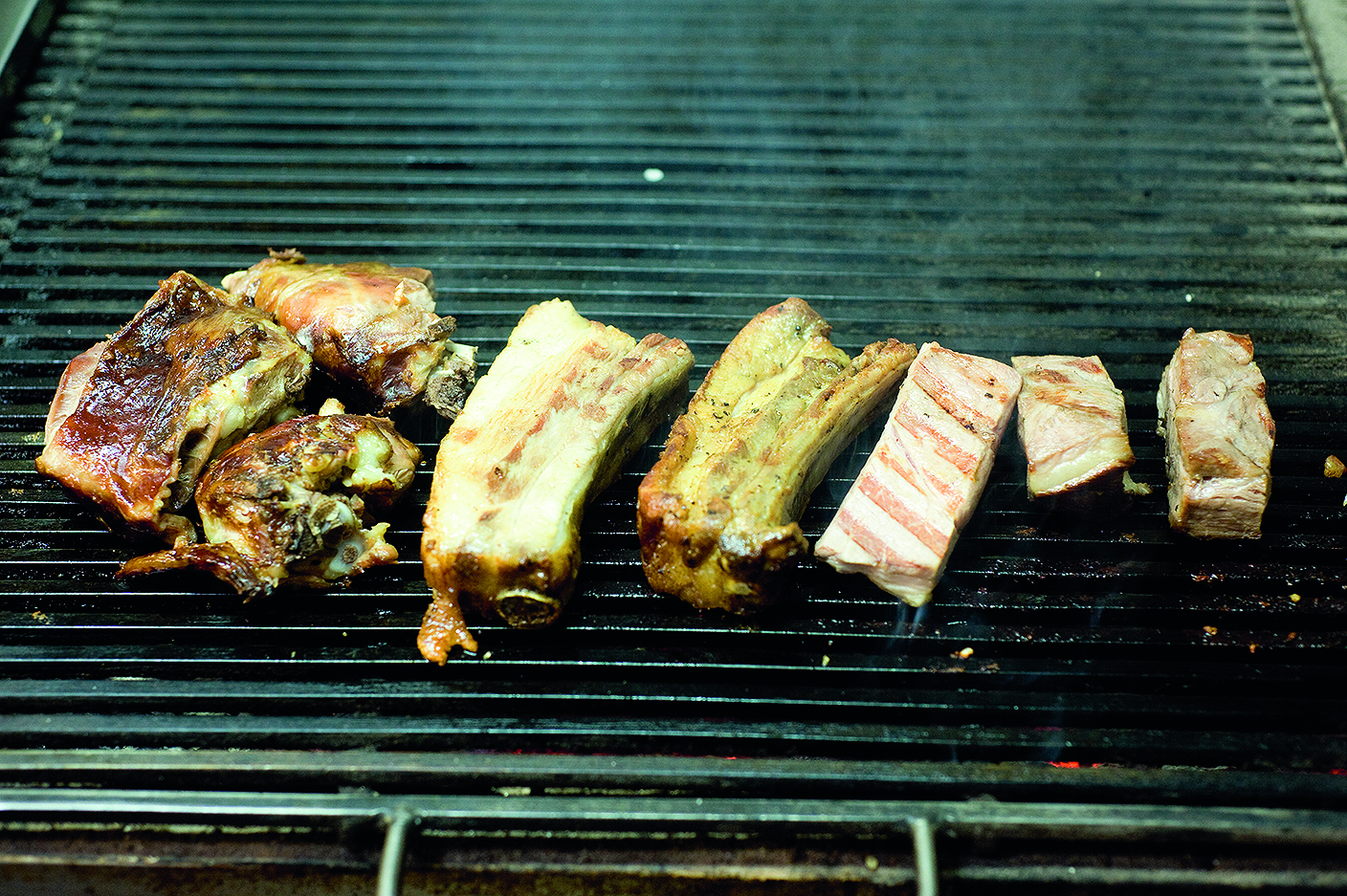 Za roštilje nam je Ivan pripremio i svinjska rebra. Njih je marinirao solju, paprom, crvenom paprikom, maslinovim uljem i češnjevima češnjaka koje nije ogulio već ih je samo malo izdrobio, da mogu izlaziti sokovi. Svinjska se rebra dime na 130 °C, od nosno dok u sredini meso ne postigne temperaturu od 84°C što se mjeri uz pomoć sonde, dodatnog dijela pušnice. Nakon dimljenja komadi svinjetine se narežu i još se stave na desetak minuta u parnu pećnicu na 150 stupnjeva.
