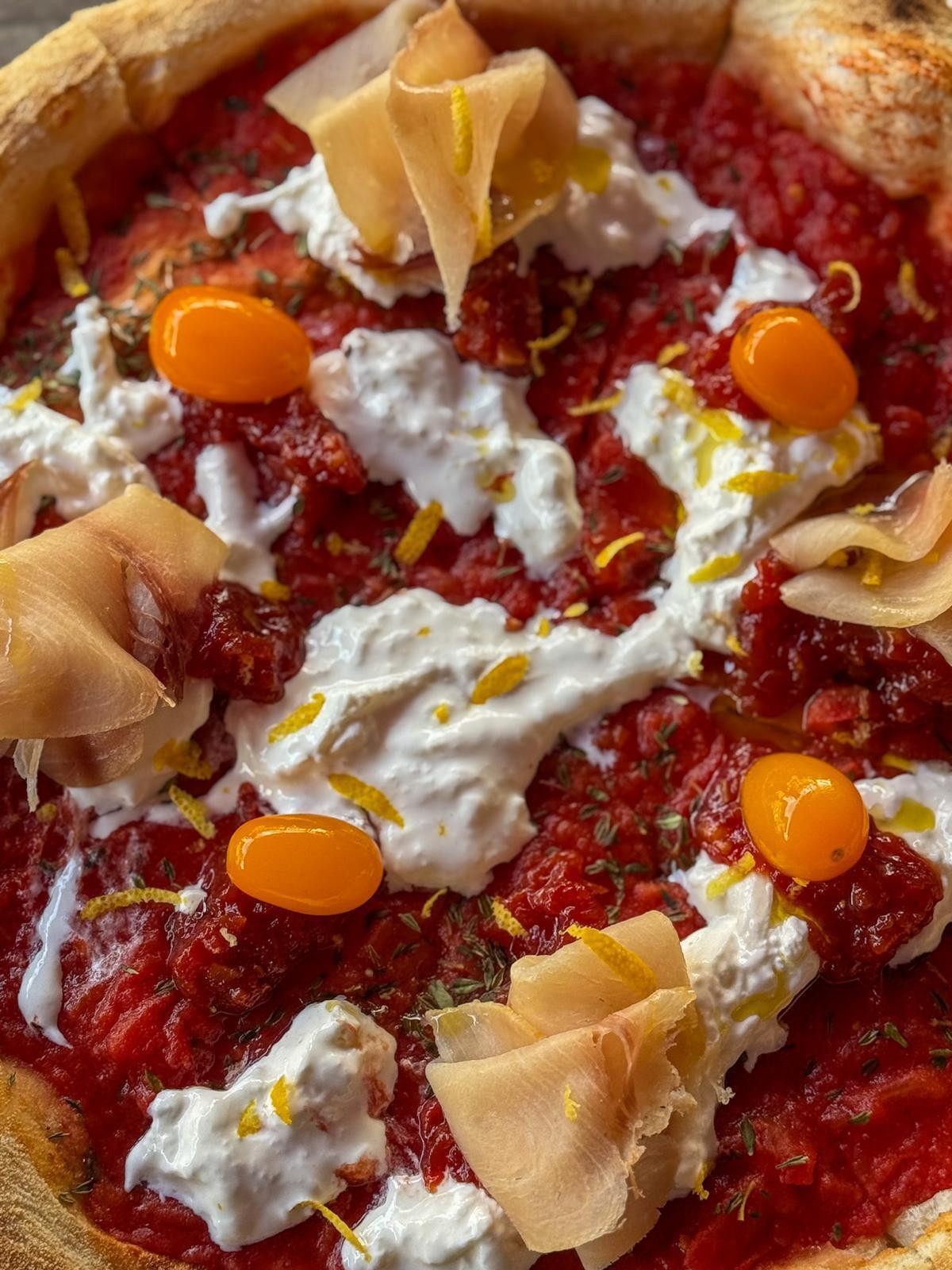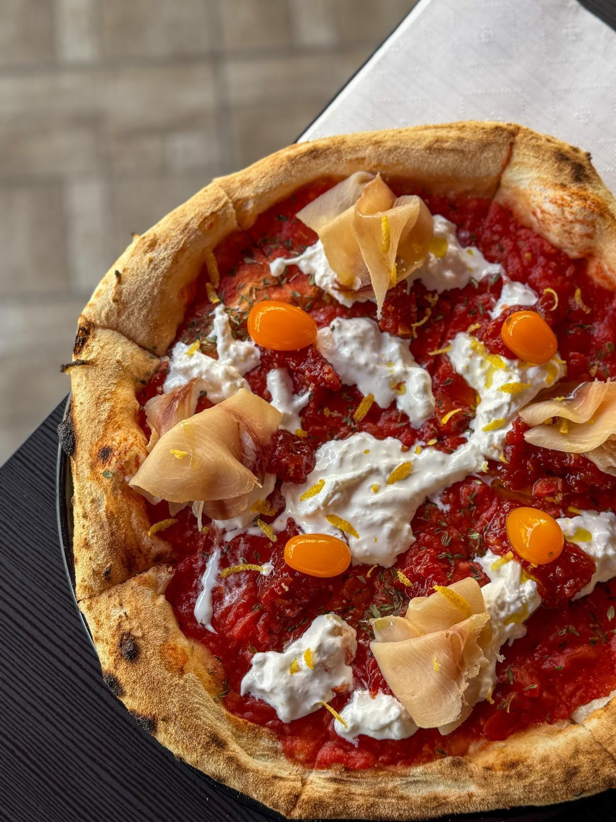 Riječ je o igri na kontrastu dubokog umamija San Marzana i kandirane slatkoće domaćeg džema od rajčice, koju oštro, ali elegantno reže jaka slanoća pršuta od sabljarke. Hladna, mliječna stracciatella služi kao smirujući kontrast, dok žuti datterini i korica limuna daju završni bljesak slatke svježine. Rezultat je kompleksna, moćna i uravnotežena pizza. Važnost je još i veća jer je riječ o verziji koju je usavršila upravo nakon natjecateljskog iskustva, što svjedoči o njezinom profesionalnom rastu.