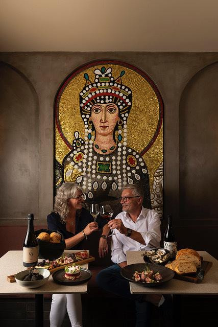 No, jednako zanimljiva kao hrana i točenje vina na čaše jest i priča o izgledu i ideji bara. Tijekom putovanja vlasnika po ‘bizantskom‘ pojasu nastala je ideja za Theodoru, pa je prostor dizajniran u tom duhu. Dominira veliki mozaik carice Teodore, moćne bizantske vladarice iz 6. stoljeća i supruge cara Justinijana, koji danas vizualno nosi cijeli bar.