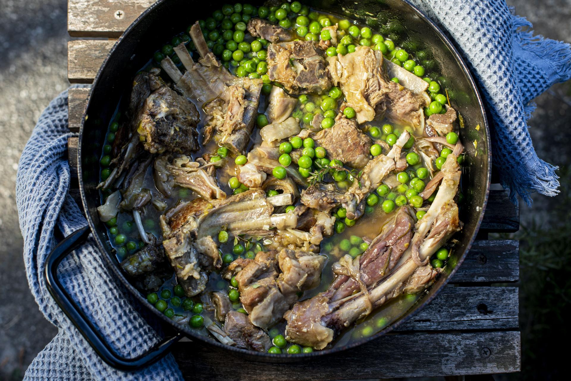 Uzeo sam rebrica isječena na manje komade kao i meso od plećke, dakle prvu četvrtinu janjca. Desnu, naravno, ipak je janje iz toga kraja. Anđelko mi, uostalom, nikada ne bi dao lijevu, to je pitanje časti. Kosti i nešto mesa kuhalo se već otprije sa strane za temeljac. Popržio sam meso sa svih strana u širokoj crnoj teći na maslinovom ulju, zatim ubacio sitno sjeckan luk, malo pancete narezane na kockice, pa kad je to sve pustilo što već ima pustiti, samo kratko, da zamiriše, popržio i malo zgnječenog češnjaka. Onda sam sve to zalio Bibićevim Debitom, jedinim bijelim vinom koje sam imao doma (jer sve mi bijelo uvijek popiju - Buljan je jedini prijatelj koji zagovara crnu opciju) i vrućim janjećim temeljcem. Ubacio sam ružmarin, lovorov list, majčinu dušicu, i kuhalo se to sve skupa, uz povremeno dolijevanje temeljca, mislim - oko sat i pol. Onda sam ubacio biže, kako Dalmatinci zovu grašak, i dokuhao. Pustio sam tu divotu da malo odstoji sa strane, a onda pozvao društvo da se pridruži. Susjeda Marica, koja ipak voli grašak na žlicu, bila je fascinirana. Odmah je nazvala prijateljicu u Šibenik.