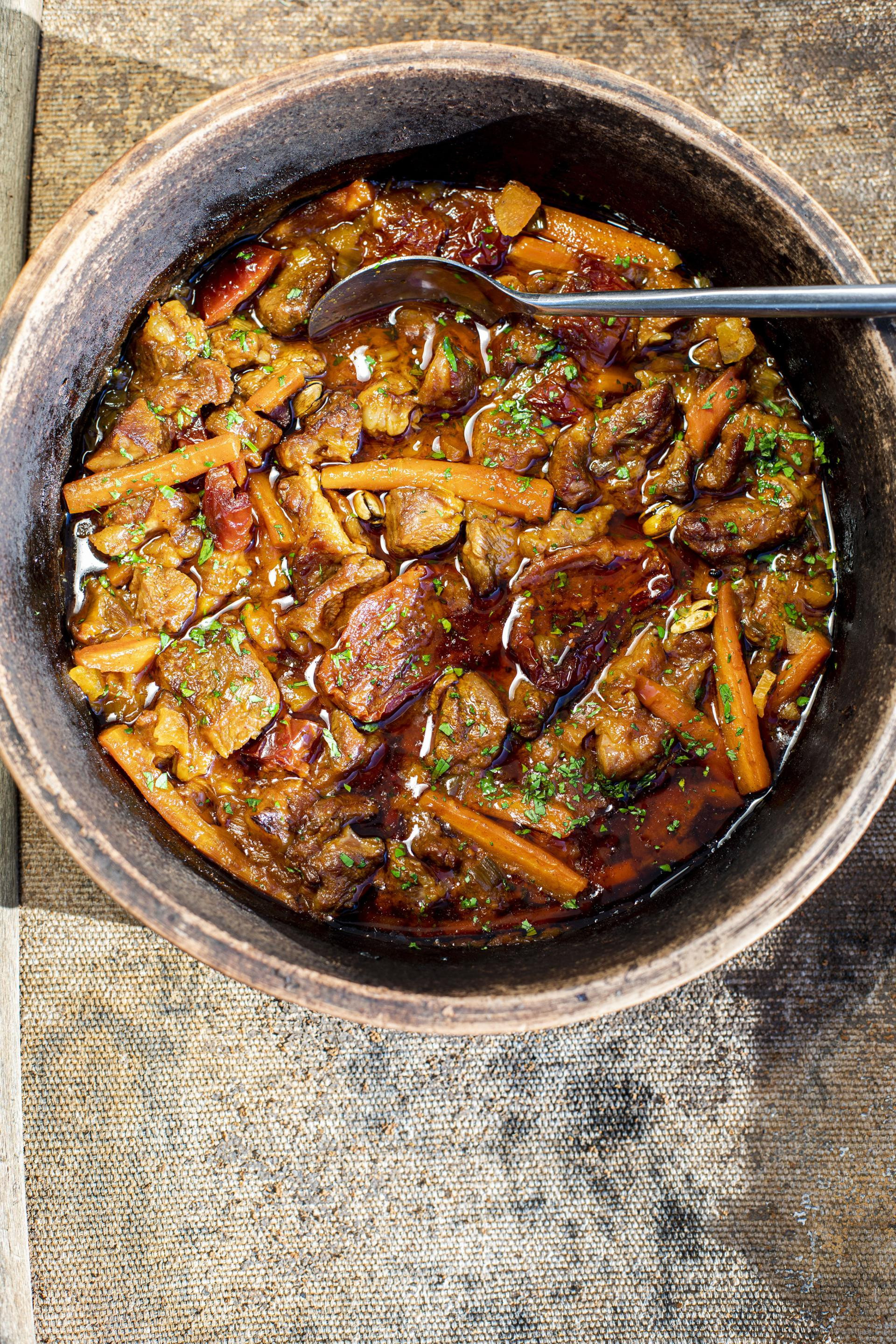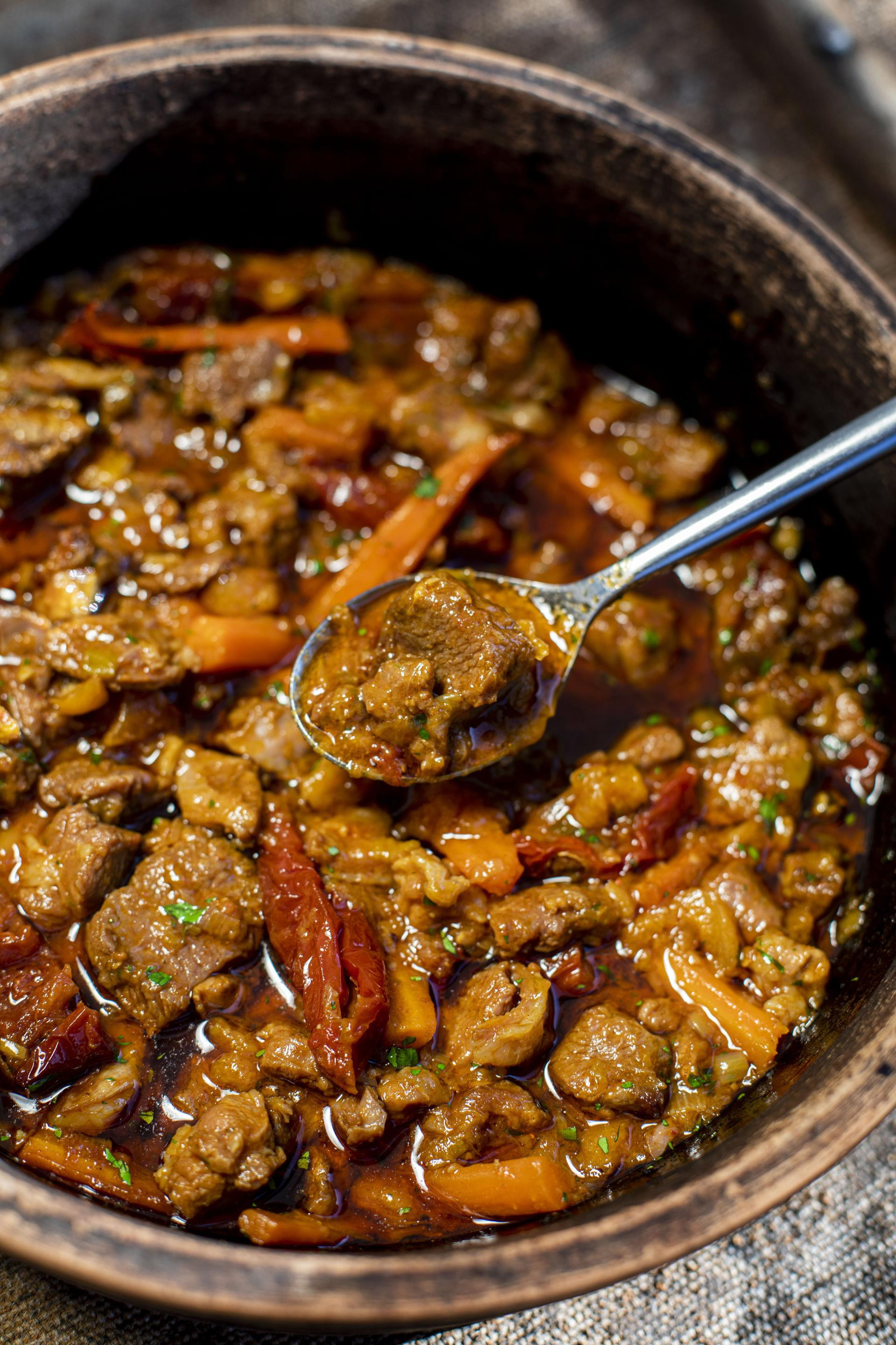 Meso narežemo na kockice, ne presitne. Zapečemo ga na maslinovom ulju i maknemo s vatre. U istoj zemljanoj posudi pirajamo luk, dodamo češnjak, a onda i sve začine. Kratko sotiramo. Vratimo meso, dodamo mrkvu narezanu na štapiće, sušene rajčice i podlijemo temeljcem. Poklopimo i stavimo u pećnicu zagrijanu na 180 stupnjeva. Nakon sat vremena otvorimo, dodamo koricu limuna i nasjeckane sušene marelice. Poklopimo i vratimo u pećnicu na još sat vremena. Izvadimo, pustimo još malo poklopljeno i onda otklopimo uz dramatičnu gestu. Miris je fantastičan, meso se topi u ustima, od okusa nam se plače. Susjeda Marica u ekstazi. Trooly, go home.