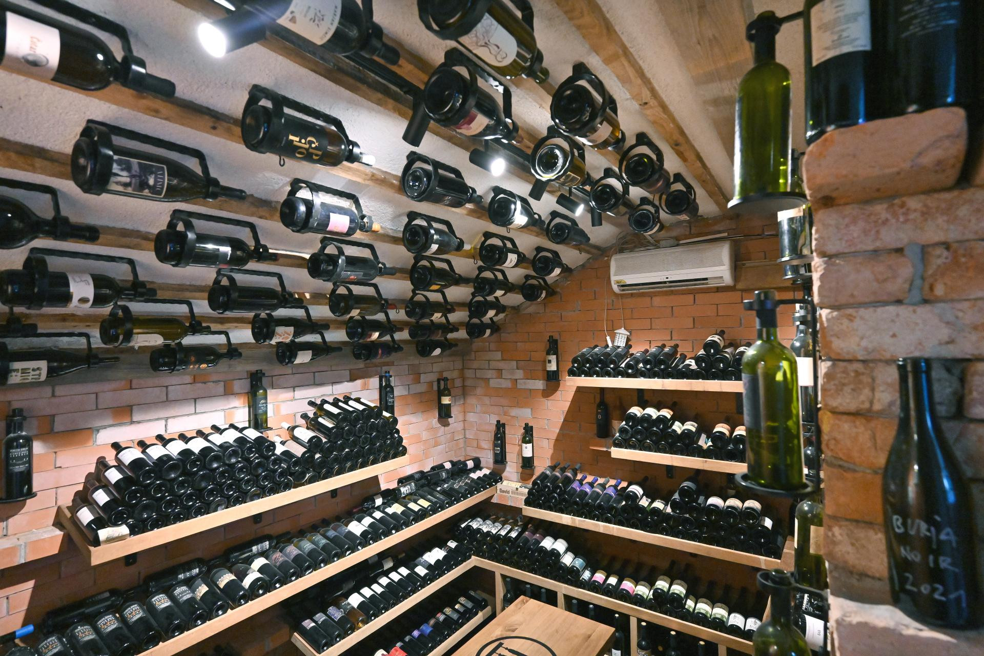 Kako silazimo, tako nas zapuhuje zamaman, nimalo agresivan miris fermentiranog mesa. U predvorju podruma u koji smo sišli samo su drveni sanduci s pirografski otisnutim logotipima slavnih vinarija. Iz predvorja se nastavlja hodnik iz kojega se ulazi u ostale prostorije. Prva lijevo opet nije komora, nego vinski podrum, najluđi i najbogatiji koji smo vidjeli u nekoj privatnoj kući koja nije vinarija. Bogatstvo u vinskoj valuti neizrecivo je: ovdje je više od dvije tisuće etiketa s najelitnijih svjetskih položaja i iz podruma - ukupno oko 12 tisuća boca različitih berbi vrijednih stotine i tisuće eura. Pogled nam kreće od raznih godišta Petrusa, preko slavnih burgundskih i bordoških Grand Cru etiketa, Champagne, alzaških i njemačkih rieslinga, cijele zbirke Barola, biranih novosvjetskih vina, luksuznih sanduka mađarskih tokaja odabranih i posvećenih papi Franji (od ukupno deset Lesar ih posjeduje tri), pa sve do vrhunskih slovenskih, austrijskih pa i hrvatskih etiketa. Cijela se ta bogata kolekcija neprestano popunjava, ali i troši na zahtjev i po želji gostiju koji dolaze kušati "najbolje salame na svijetu". A dolaze odasvud, mnogi od njih vjerojatno privučeni upravo mogućnošću nesvakidašnjeg sparivanja hrane i vina.