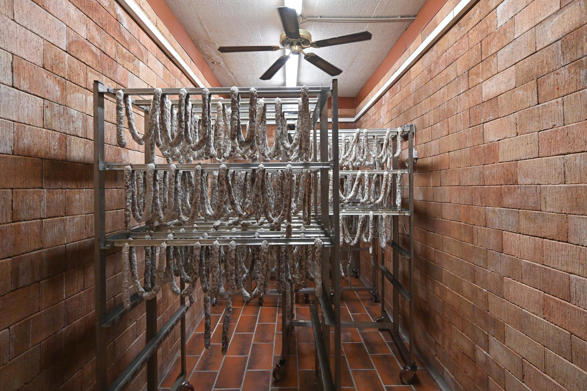 U sljedećoj prostoriji slijeva napokon ugledamo ono radi čega smo i došli: salame zriju na posebnim vješalicama, presvučene hifama plemenite bijele plijesni. Komora, jedna od četiri slične, nesvakidašnja je i originalna, izgrađena i uređena prema zamislima Davida Lesara, koji nigdje drugdje u svijetu nije mogao vidjeti sličnu. Na stropu iznad pomičnih stalaka na kojima vise salame vrti se ventilator. Klima-uređaja, koji se danas smatraju obaveznim u sličnim pogonima, ovdje nema - samo prirodna ventilacija i prirodna vlaga koja se nakuplja i emanira iz zidova od jednom "žgane", custom made opeke. Takva, samo jednom pečena opeka, koju je Lesar posebno naručio za svoj podrum i kojom su obloženi zidovi komore, ne samo da upija i zadržava vlagu koja kapilarno dolazi od obližnje Bistrice, nego su se u njoj nastanili mikroorganizmi i plijesni koji omogućuju perfektno okružje za zrenje salama i kobasica.