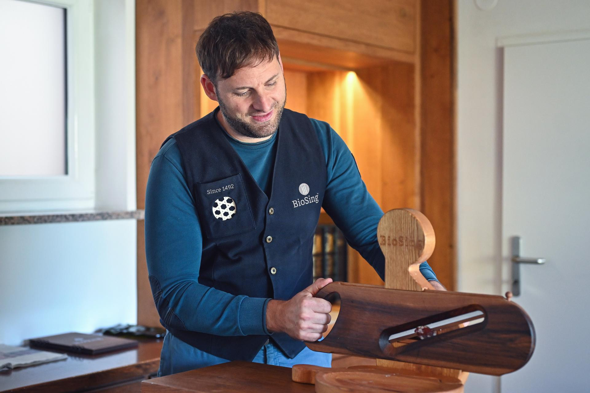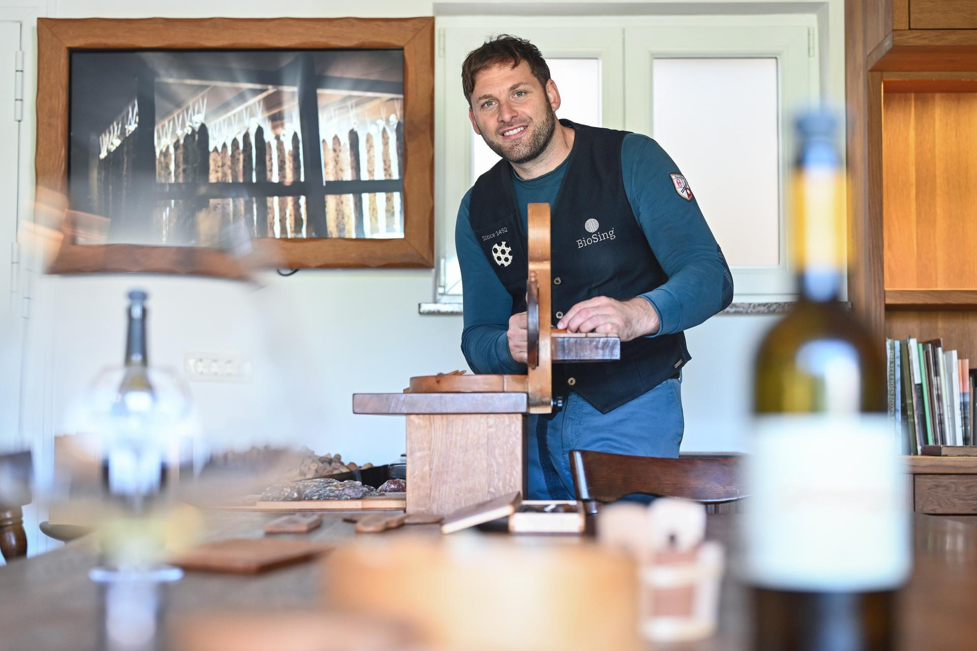 Za stolom nas čeka poseban degustacijski pribor, sav od drva, izrađen ovdje, u Ribnici. David Lesar neće poput svih drugih svoje salame rezati na crvenoj "berkelici", već na originalnoj drvenoj salamoreznici koju je izradio lokalni majstor. Narezanu salamu poslužit će nam na posebnom drvenom pladnju s utorima preko kojih je polaže, kako bi sa svih strana imala zraka, "prodisala" i razvila arome. Svaki je drveni detalj, od daski za posluživanje do običnih čačkalica, proizveden ručno u najbližem susjedstvu, a sve se nalazi, uz suhomesnate proizvode, i u ponudi na BioSingovu web-shopu.