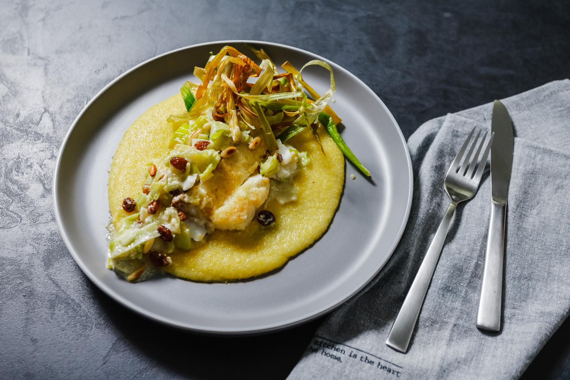 Poriluk prerežite napola. Gornji, zeleni dio narežite na tanke dugačke trake. Uvaljajte ih u brašno i pržite u dubokoj posudi u suncokretovu ulju dok ne postanu hrskave. Izvadite na papir da upije višak masnoće. Komade bakalara od oko 200 g uvaljajte u brašno. U tavi rastopite i zagrijte maslac pa, kad je vruć, dodajte komade bakalara. Kad poprime zlatnu boju s obje strane, izvadite ih i odložite sa strane. U istu tavu dodajte ostatak poriluka narezanog na kockice. Dodajte sol i bijeli papar te pirjajte dok ne omekša. Dodajte mlijeko, prethodno na tavi tostirane pinjole i grožđice omekšane u vodi. Kuhajte dok se mlijeko ne reducira na pola i tada vratite bakalar u tavu. U međuvremenu u slanoj vodi skuhajte palentu da bude mekana. Servirajte palentu na tanjur, dodajte file bakalara i umak, a na kraju i hrskavi poriluk.