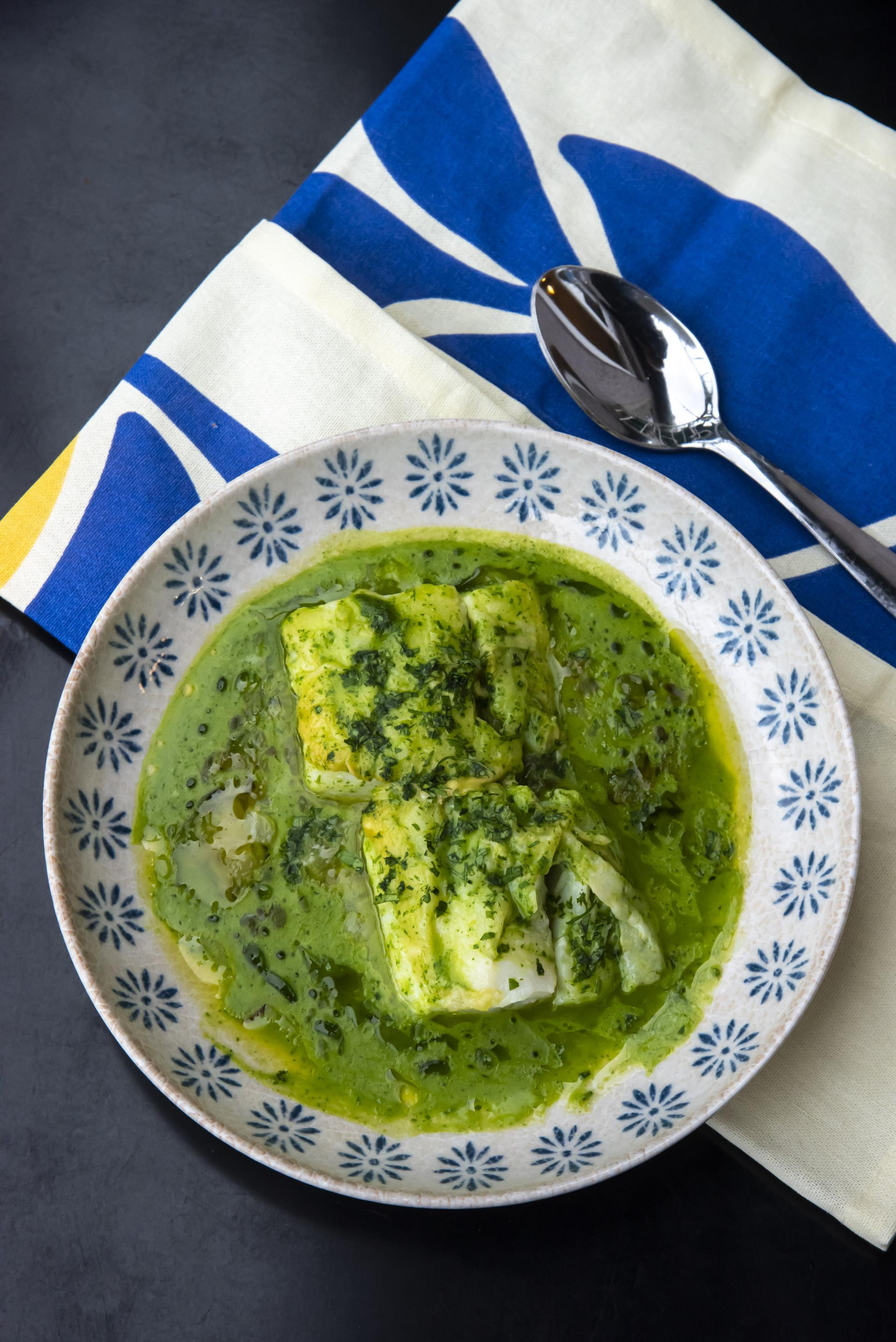 Sitno nasjeckajte luk i pirjajte ga s češnjakom. Maknite s vatre i umiješajte malo sitno nasjeckanog peršina. Pripremite riblji velouté: u loncu rastopite maslac, umiješajte brašno i kratko popržite na laganoj vatri. Postupno dodajte topli riblji temeljac dok ne dobijete gusti umak. U blender stavite 150 - 200 ml veloutéa i oko 50 g peršina pa izmiksajte u glatki zeleni umak. Držite ga na toplom. U taj peršin-velouté stavite bakalar i lagano ga confitirajte 4 - 5 minuta. Pri posluživanju dodajte pirjani luk i peršin u umak te prelijte preko fileta bakalara.