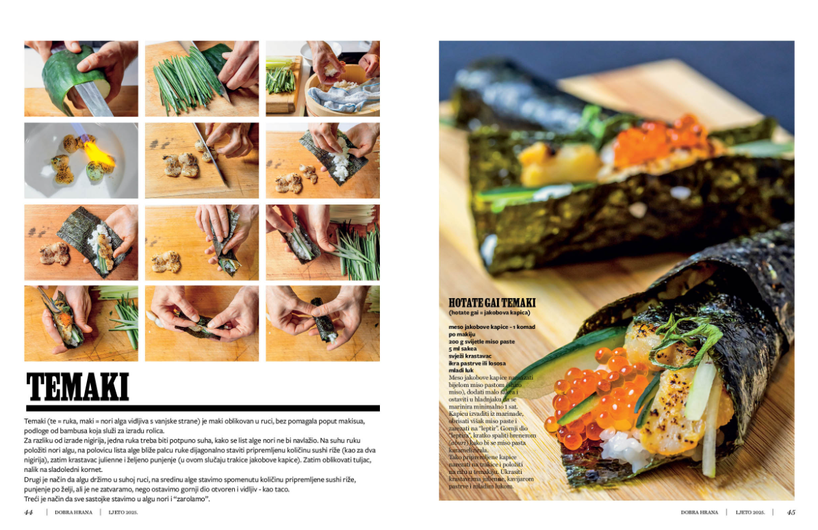 Majstor učitelj Robert Horvat iz Gastronomada u ljetnom broju Dobre hrane pripremio nam je i pokazao kako napraviti šest sushija ‘iz ruke‘ u koje je ugradio i hrvatske namirnice, a Zoran Šimunić Šime upoznaje nas sa svim prednostima woka - najsvestranijeg alata bogate azijske kuhinje - te kuha neka od nezaobilaznih jela ove popularne kuhinje.