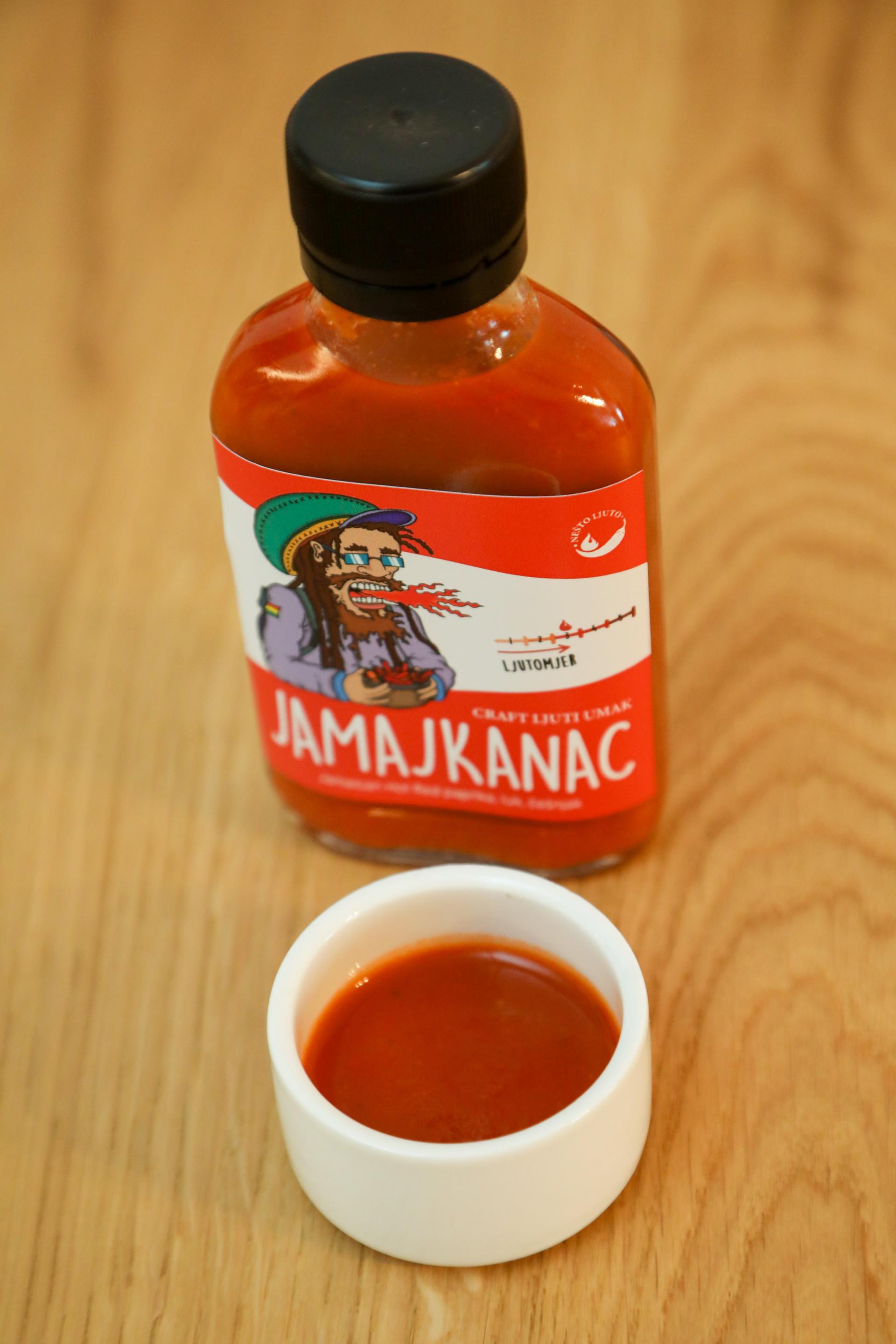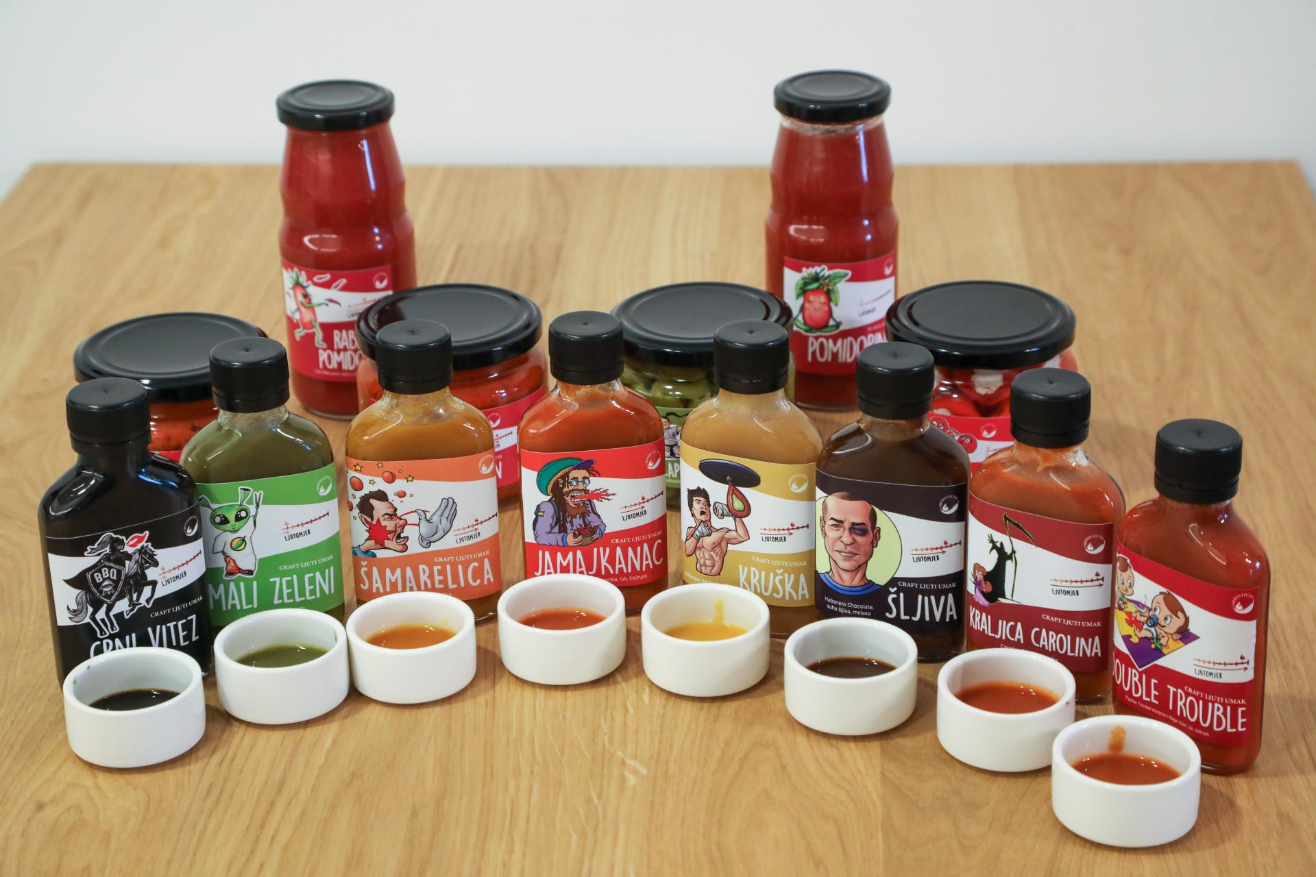 -U aktualnoj paleti imamo osam ljutih umaka: od najblažeg ‘Crnog viteza‘ do ‘Kraljice Karoline‘. Crni vitez je, po meni, najkompleksniji i najpitomiji: nema kečapa, bazu drži pečena rog paprika na roštilju da dobije okus po dimu, uz ljutu papriku, naše sušene šeri pomidore, eko med, marmeladu od ljubičaste kapule i aceto.I to ne možeš dobiti fermentacijom. ‘Jamajkanac‘ je na paprici Jamaican Hot Red, s češnjakom, lukom i našim San Marzanom. Po ljutini to je sredina, po guštu klasik. Ide uz pizzu, paštu, burger, meso. ‘Šljiva‘ nosi Habanero Chocolate sa suhom šljivom i melasom. To je umak za meso, sporo kuhano meso i divljač. ‘Kruška‘ je svijetla i svježa gdje kompotska tehnika i limun čuvaju boju, a ‘Marelica & Fatalii‘ spaja žutu fatalii s marelicom u mirisnu, voćnu oštrinu. ‘Double Trouble‘ je namjerno ‘dupli problem‘. U umaku su superljute paprike poput Trinidad Scorpiona i Naga Vipera, ali baza ostaju češnjak, luk i pomidor. Na etiketi su blizanci, jer ih imaju i Igorova i moja sestra. Na vrhu ljutine je ‘Kraljica Karolina‘ – Carolina Reaper. S takvim paprikama ne treba komplicirati. U umak idu češnjak, luk i pomidor i treba imati puno poštovanja pri doziranju, objašnjava nam Sandro potanko njihovu filozofiju ljutog.