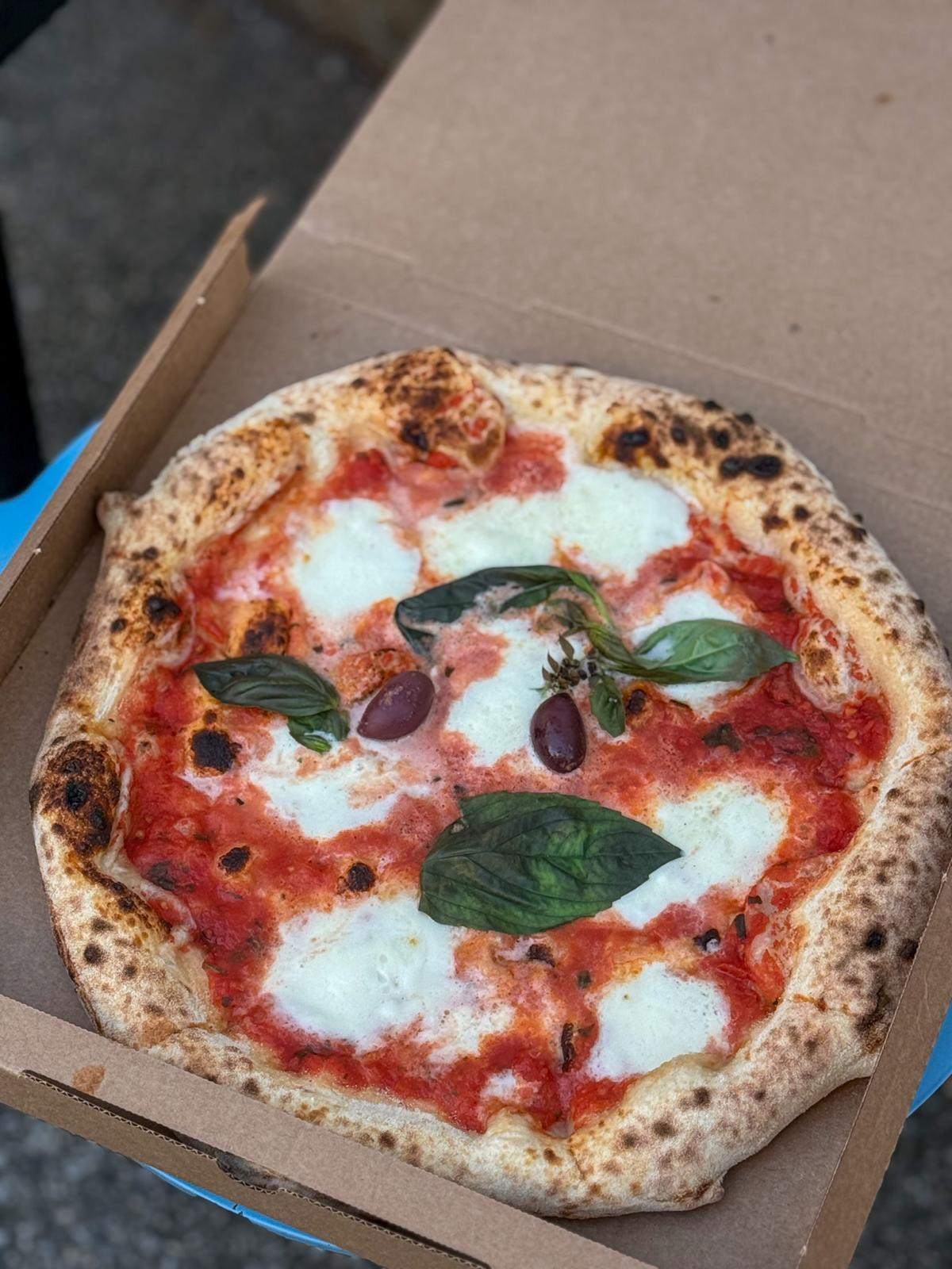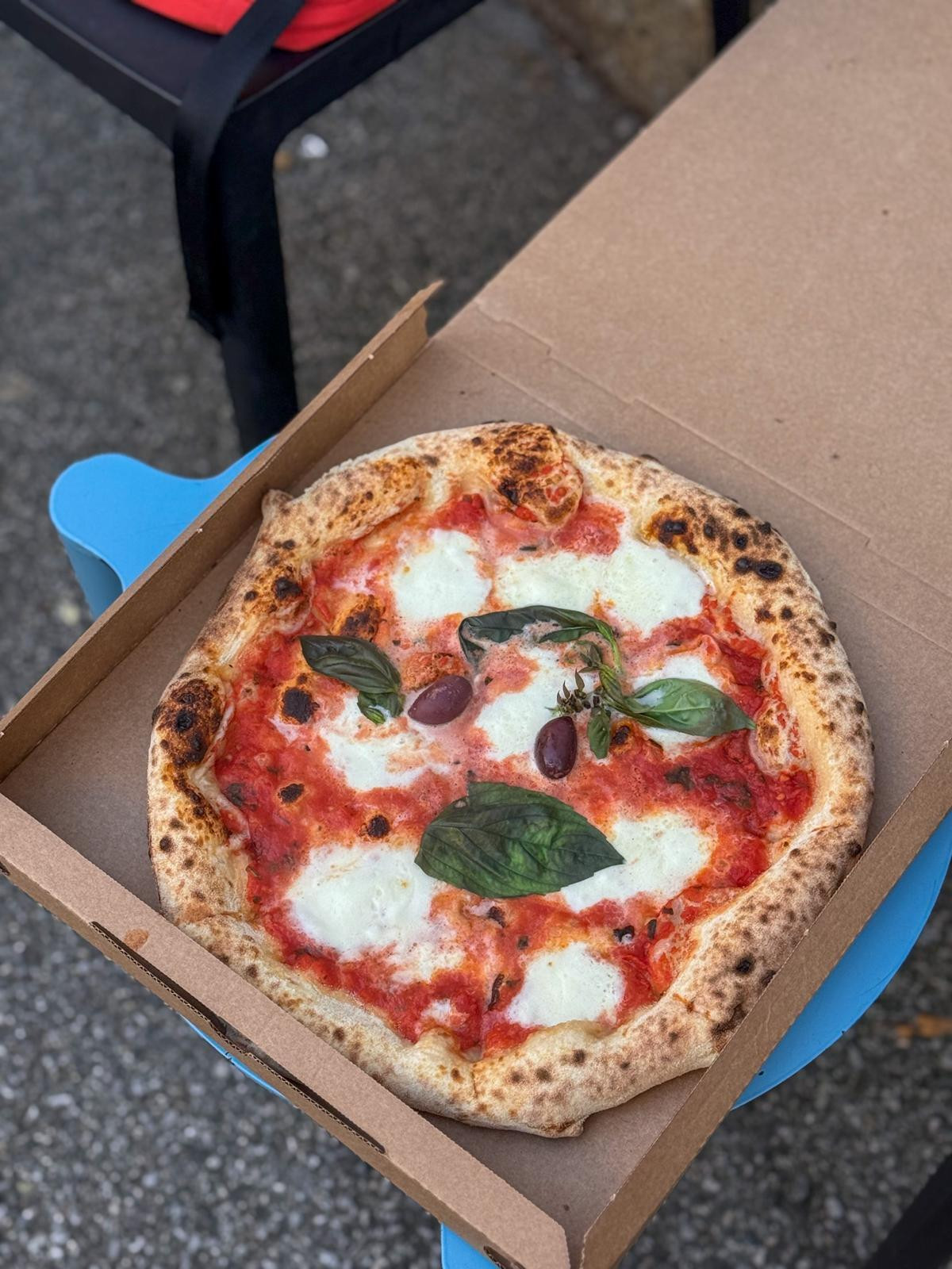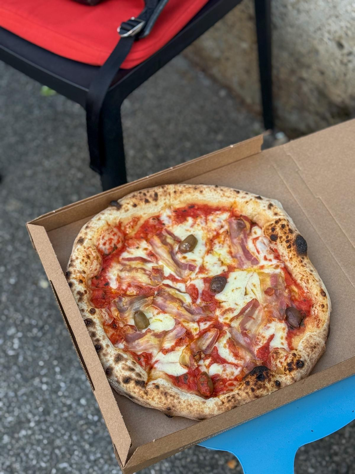 Naručili smo dvije pizze: Bufalinu (12 €) i Zrinjevac (13,50 €), koja sadrži sušenu pancetu, češnjak i masline. Pizze su bile gotove vrlo brzo. Budući da smo ih jeli neposredno nakon preuzimanja, zadržale su optimalnu svježinu. Otvorenim ostaje pitanje kako bi se tijesto ovog tipa napoletane ponašalo prilikom duže dostave. Usporedbom s pizzama iz matičnog restorana, uočili smo blagu promjenu glede samoga tijesta. Sastojci se čine identičnima, no tijesto ima nešto nižu hidrataciju, što rezultira hrskavijim rubom i čini ga pogodnijim za dostavni format. Sviđa nam se.