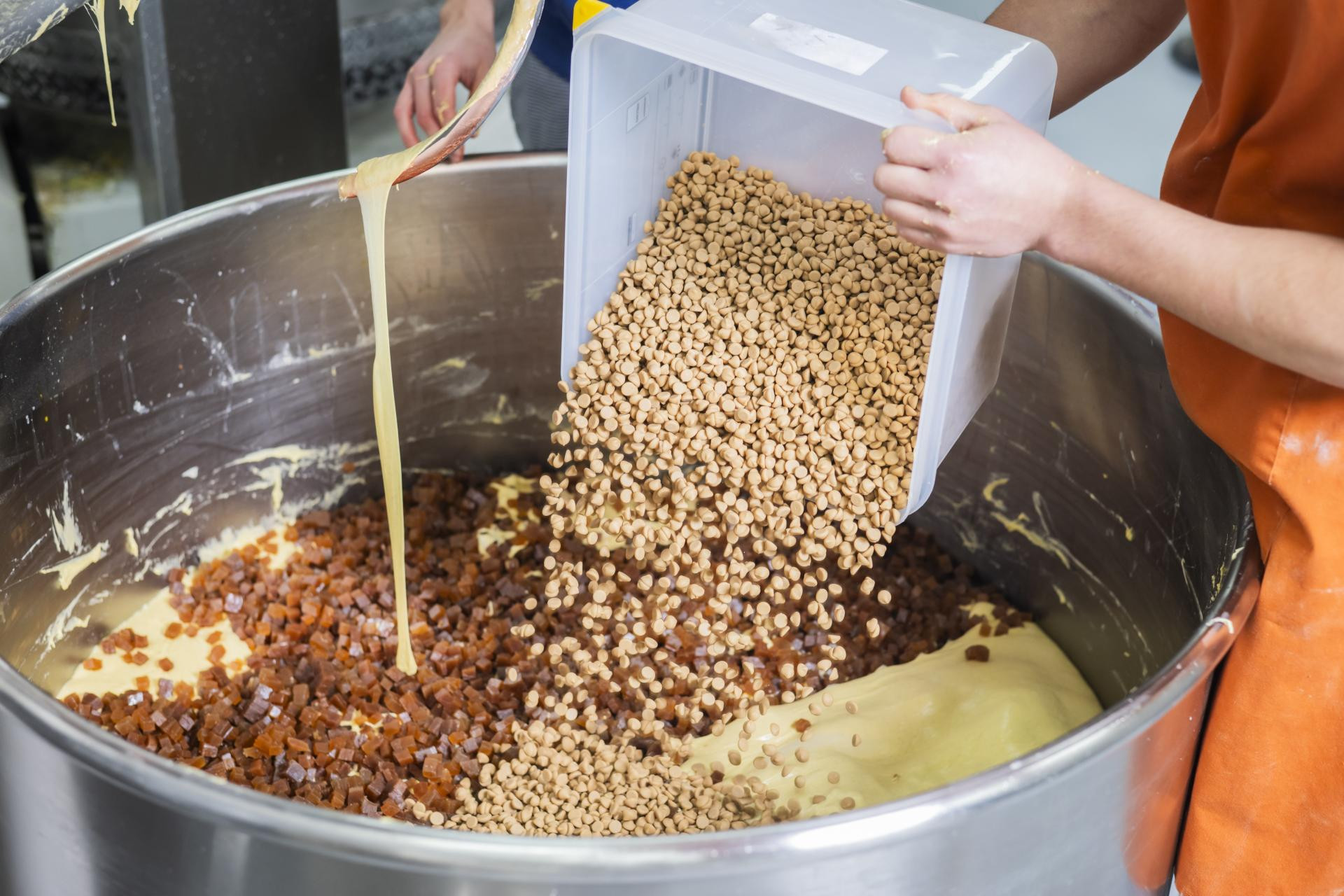 Nakon prvog zamjesa slijedi prva fermentacija u trajanju od 18 sati, a potom miješanje tijesta, što traje sat vremena. Pritom se u tijesto dodaje još maslaca, jaja i mlijeka, i stvara se drugi zamjes. Sada se dodaju i dodaci, ovisno o tome koji se okus panettonea priprema. U jednom stroju za miješanje odjednom se miješa oko 70 kilograma tijesta.