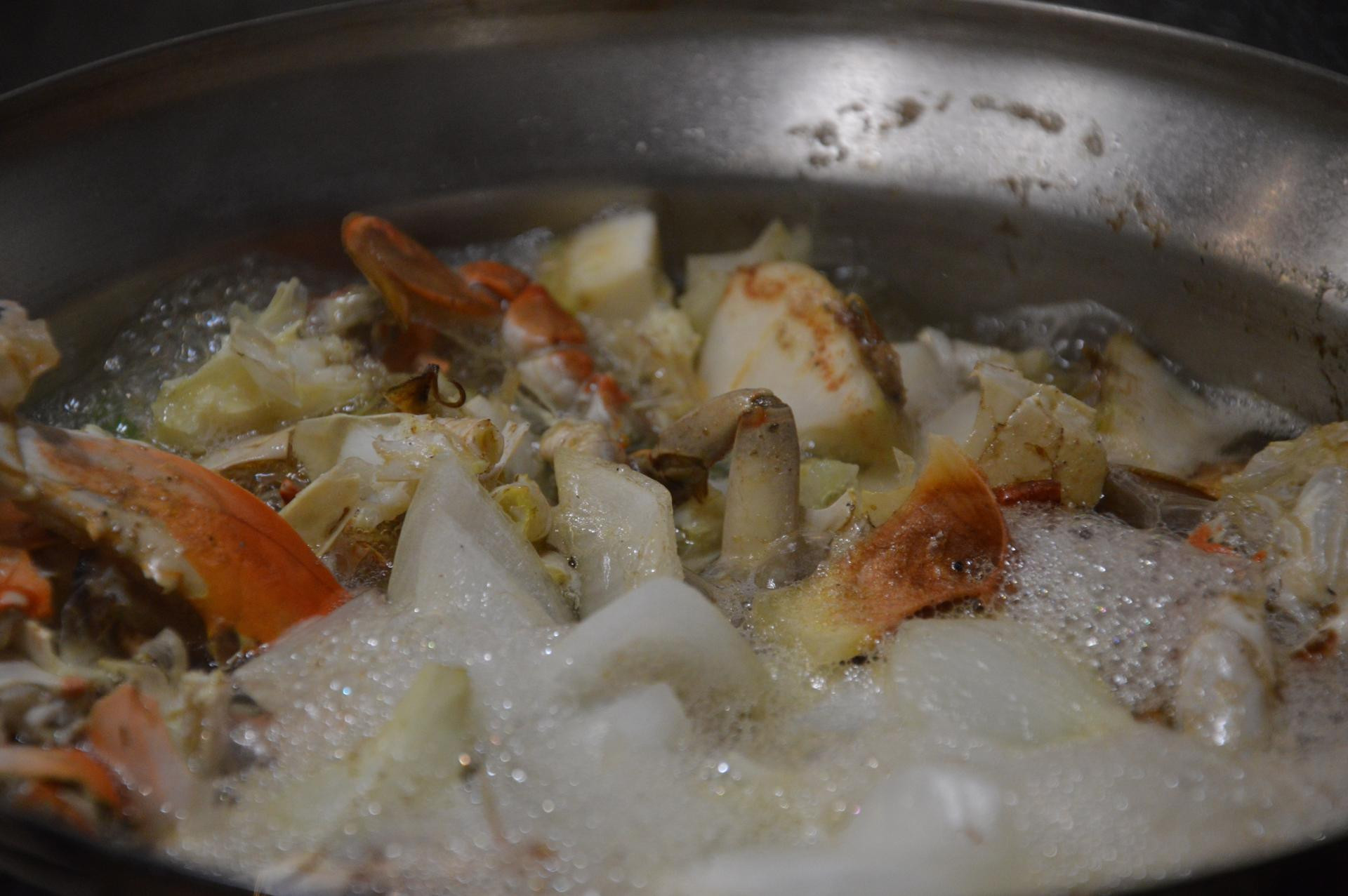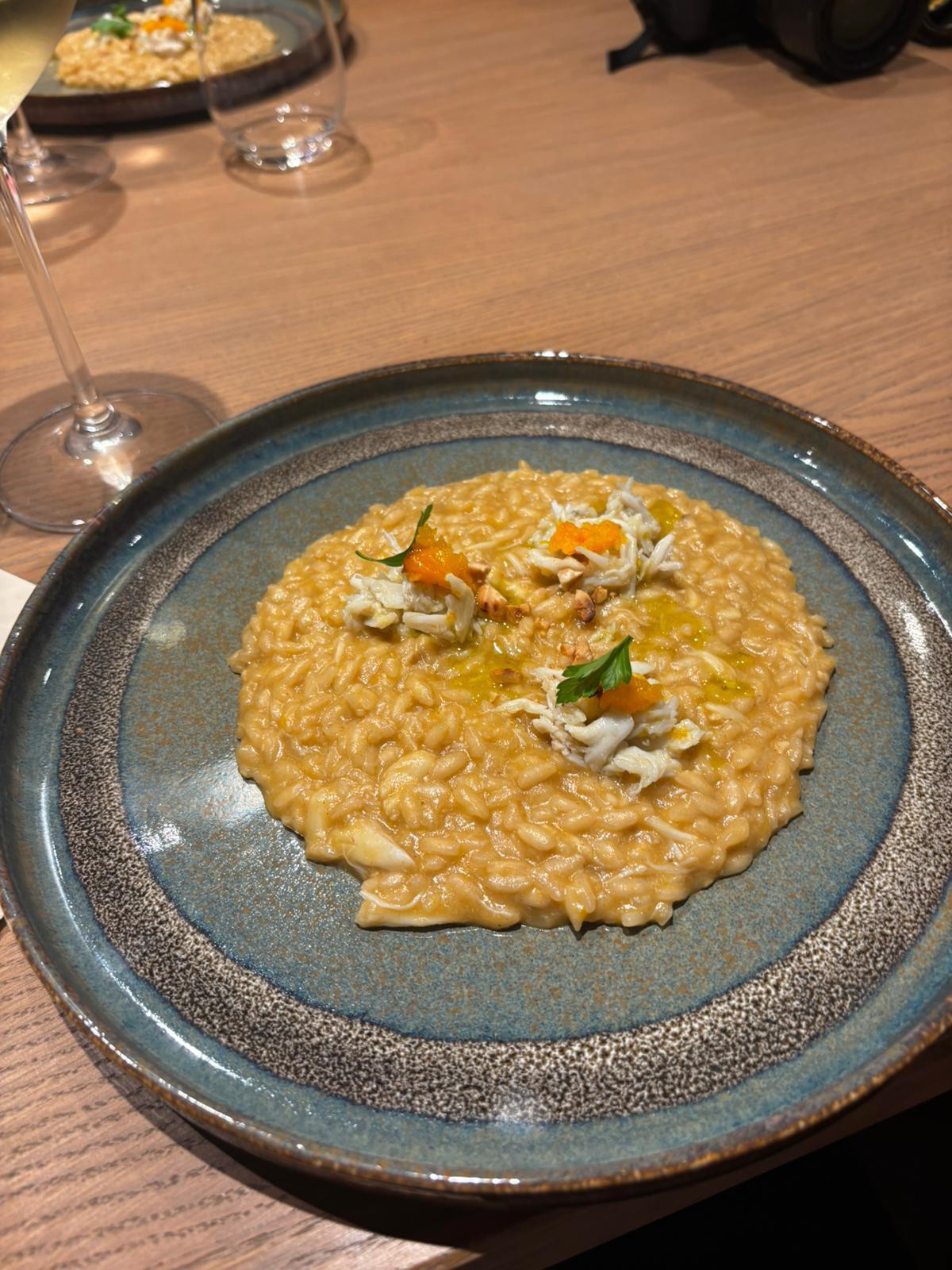Rižoto od plavoga raka s mariniranim plavim rakom u soku od mandarine, pečenom Hokaido tikvom i tostiranim lješnjacima, sljubljen s mladim ekstra djevičanskim maslinovim uljem (Cossetto, berba 2025) mješavine sorata buža, istarska bjelica, picholine I leccino te vinom Chardonay (Cossetto, berba 2022).