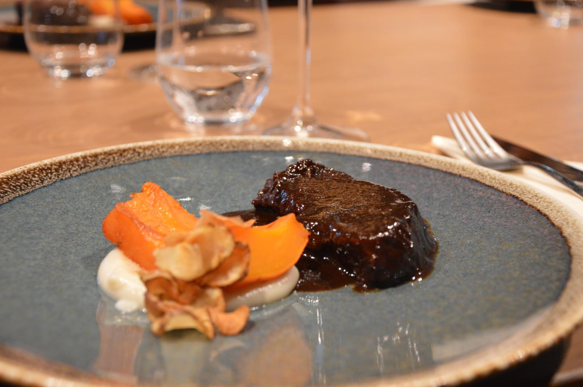 Pašticada od divlje svinje s pečenom Hokaido tikvom, kremom od čičoke i čips od kore čičoke, sljubljena s mladim ekstra djevičanskim maslinovim uljem (Cossetto, berba 2025) mješavine sorata buža, istarska bjelica, picholine I leccino te vinom Mozaik (Cossetto, berba 2021) mješavine sorata merlot I refošk.
